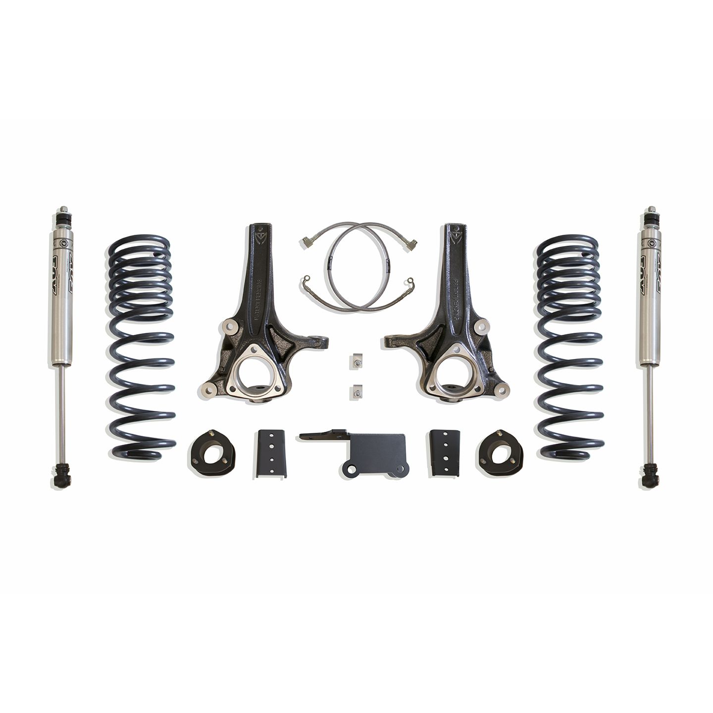 MAX TRAC SUSPENSION'S KIT# K882774F IS A COMPLETE 7" LIFT KIT INCLUDING SPINDLES, EXTENDED BRAKE LINES, REAR COILS, TRAC BAR BRACKET, SWAY BAR BRACKETS & FOX 2.0 PERFORMANCE SERIES REAR SHOCKS