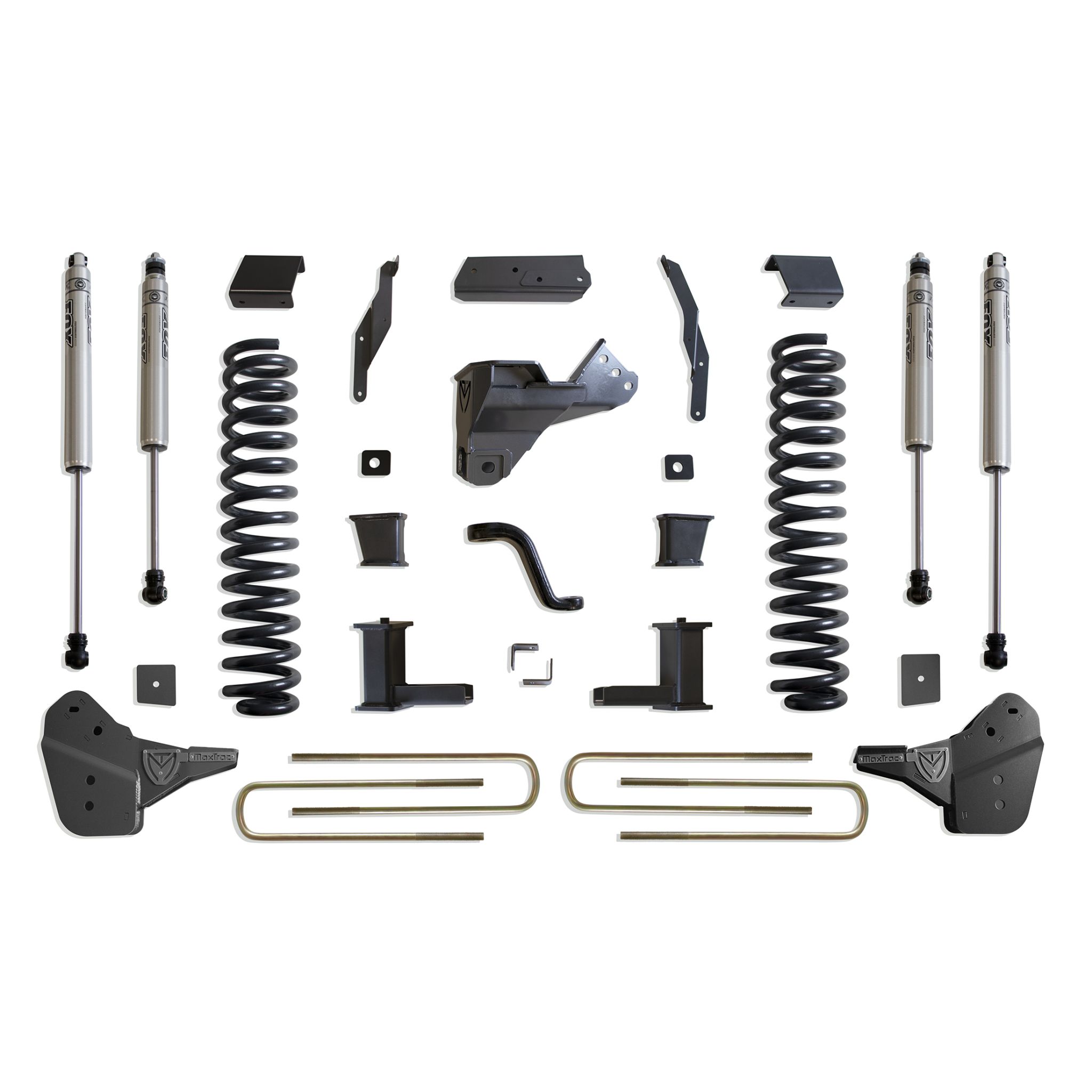 MAX TRAC SUSPENSION'S KIT# K944385F IS A COMPLETE 8" LIFT KIT INCLUDING DIESEL COILS, RADIUS ARM BRACKETS, TRAC BAR BRACKET, SWAY BAR BRACKETS, BUMP STOP EXTENSIONS, PITMAN ARM, BRAKE LINE BRACKETS, BLOCKS, U-BOLTS & FRONT/REAR FOX 2.0 PERFORMANCE SERIES SHOCKS