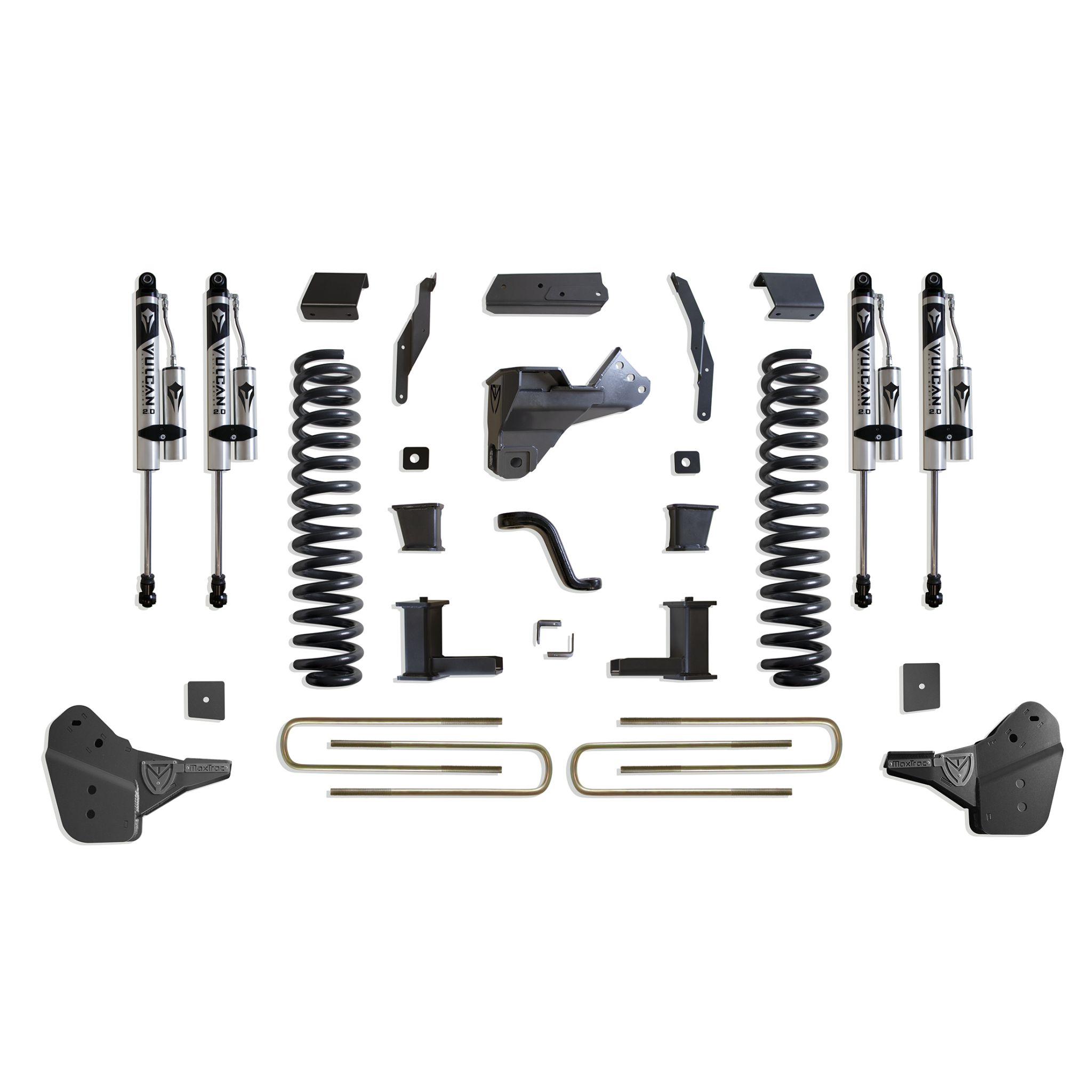 MAX TRAC SUSPENSION'S KIT# K944385VR IS A COMPLETE 8" LIFT KIT INCLUDING DIESEL COILS, RADIUS ARM BRACKETS, TRAC BAR BRACKET, SWAY BAR BRACKETS, BUMP STOP EXTENSIONS, PITMAN ARM, BRAKE LINE BRACKETS, BLOCKS, U-BOLTS & FRONT/REAR VULCAN SERIES RESERVOIR SHOCKS