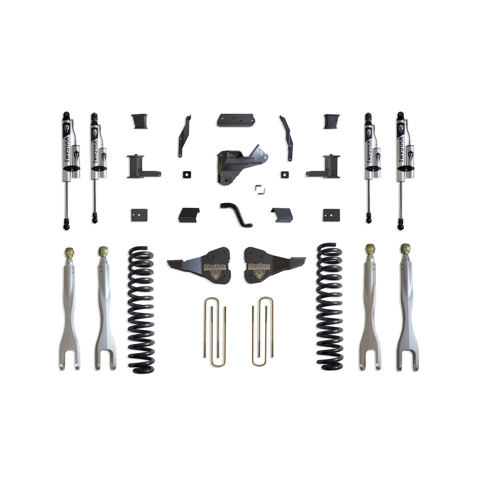 MAX TRAC SUSPENSION'S KIT# K943385VRL IS A COMPLETE 8" LIFT KIT INCLUDING DIESEL COILS, FORGED ALUMINUM 4 LINKS, TRAC BAR BRACKET, SWAY BAR BRACKETS, BUMP STOP EXTENSIONS, PITMAN ARM, BRAKE LINE BRACKETS, BLOCKS, U-BOLTS & FRONT/REAR VULCAN SERIES RESERVOIR SHOCKS
