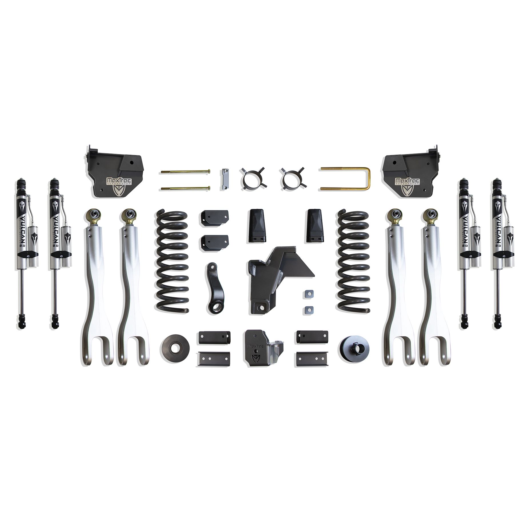 MAX TRAC SUSPENSION'S KIT# K947485VRL IS A COMPLETE 8" LIFT KIT INCLUDING DIESEL COILS, FORGED ALUMINUM 4-LINKS, TRAC BAR BRACKET, PITMAN ARM, SWAY BAR BRACKETS, BUMP STOPS, REAR COIL SPACERS, TRAC BAR BRACKET, SWAY BAR BRACKETS, BUMP STOP EXTENSIONS & FRONT/REAR VULCAN SERIES RESERVOIR SHOCKS