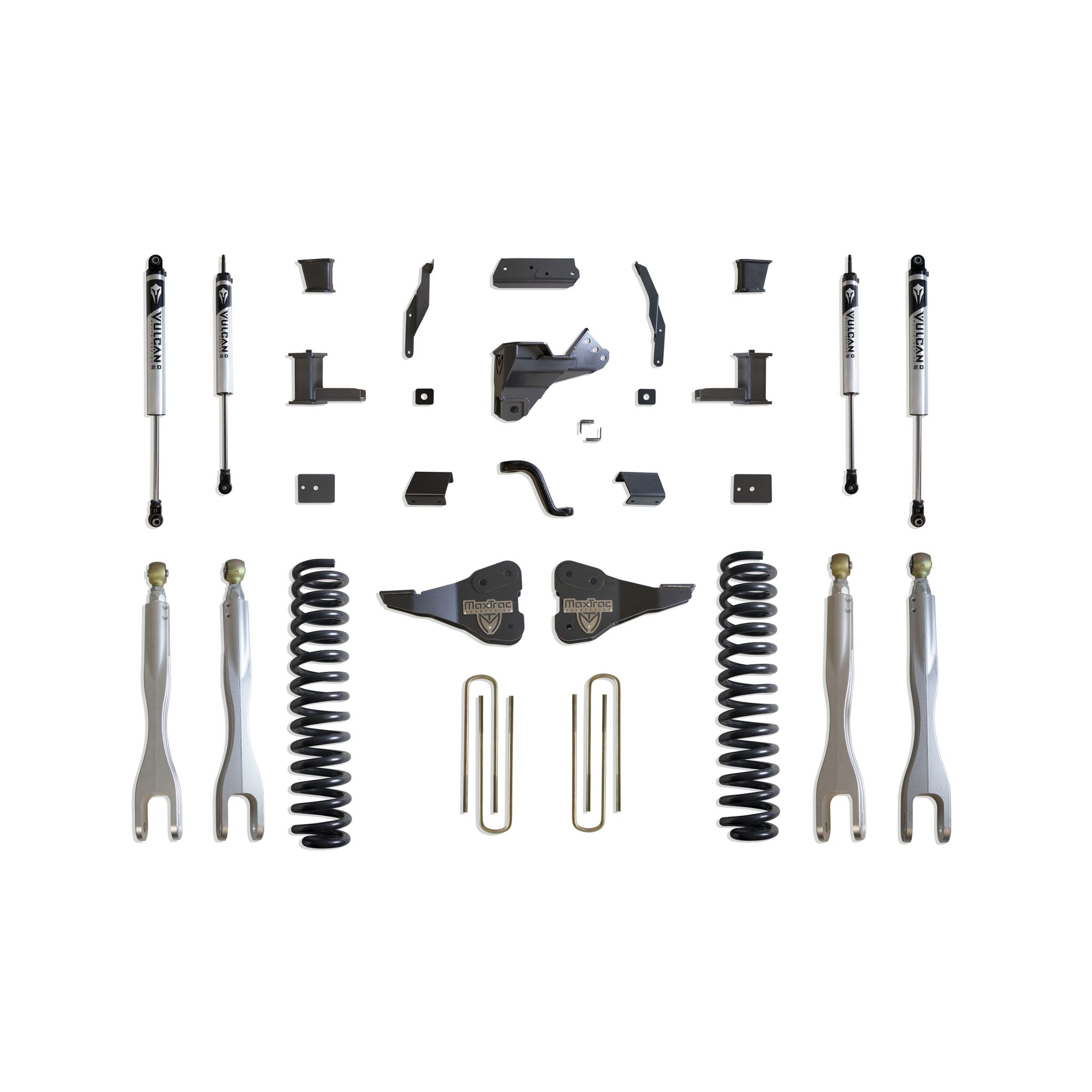 MAX TRAC SUSPENSION'S KIT# K943385VL IS A COMPLETE 8" LIFT KIT INCLUDING DIESEL COILS, FORGED ALUMINUM 4 LINKS, TRAC BAR BRACKET, SWAY BAR BRACKETS, BUMP STOP EXTENSIONS, PITMAN ARM, BRAKE LINE BRACKETS, BLOCKS, U-BOLTS & FRONT/REAR VULCAN SERIES SHOCKS