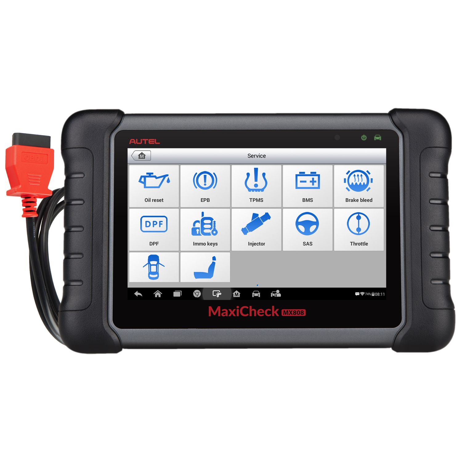 The MX808 is a combination service and diagnostic scan tool. The 7-inch touchscreen tablet comes equipped with an Android 4.4.4 operating system, a 1.5GHz quad-core processor, 32G hard drive, and the Autel MaxiSYS system suite software. It can access all available modules in all systems, performs AutoSCAN and AutoVIN (2006+), currently has 17 service functions including ABS brake bleed, and generates printable diagnostic reports. The MX808 can graph/record/playback live data, display live and freeze frame data, performs I/M readiness/emissions testing, enhanced Mode 6 diagnostics, and can set inspection 1&2 service intervals. The MX808 is updatable via Wi-Fi and includes an OBDII cable. A 1-year tool warranty and 1 year of free software updates are available with purchase. This tool is eligible for TCP expanded coverage.