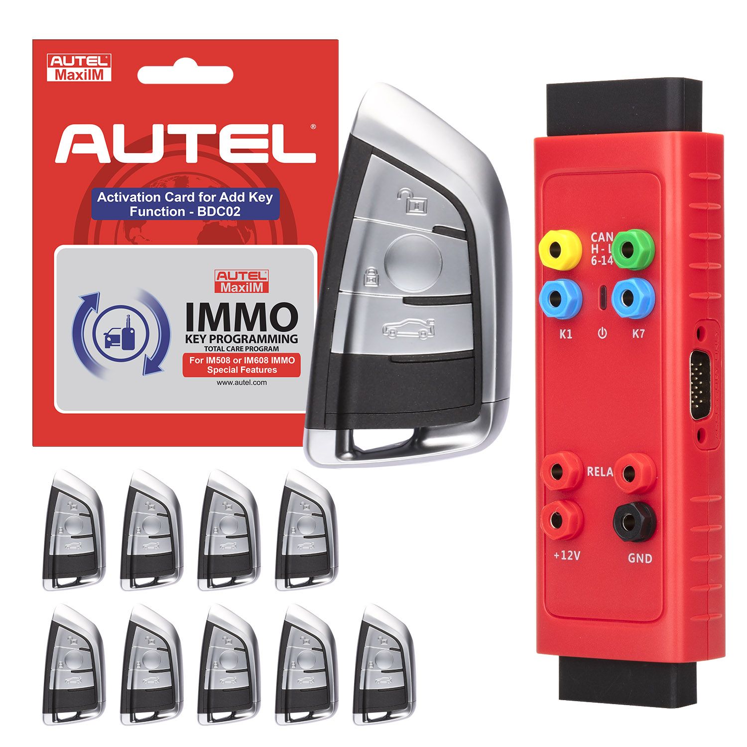 IKEYBRAZ3GB bundle includes the IMMO1YRUP, a software upgrade card for the Autel IM508 and IM608 advanced key and programming tablets that provides one year "add key" capability for BMWG-chassis vehicles, the Autel MaxiIM G-BOX3 adapter, and 10 Autel IKEY BMW-Style Razor 3-button programmable smart keys. Bundle components are covered by a one-year limited warranty. Autel key programming and IMMO products are designed for professional locksmiths and NASTF-registered Vehicle Security Professionals. Please ensure you meet local licensing requirements before purchasing.