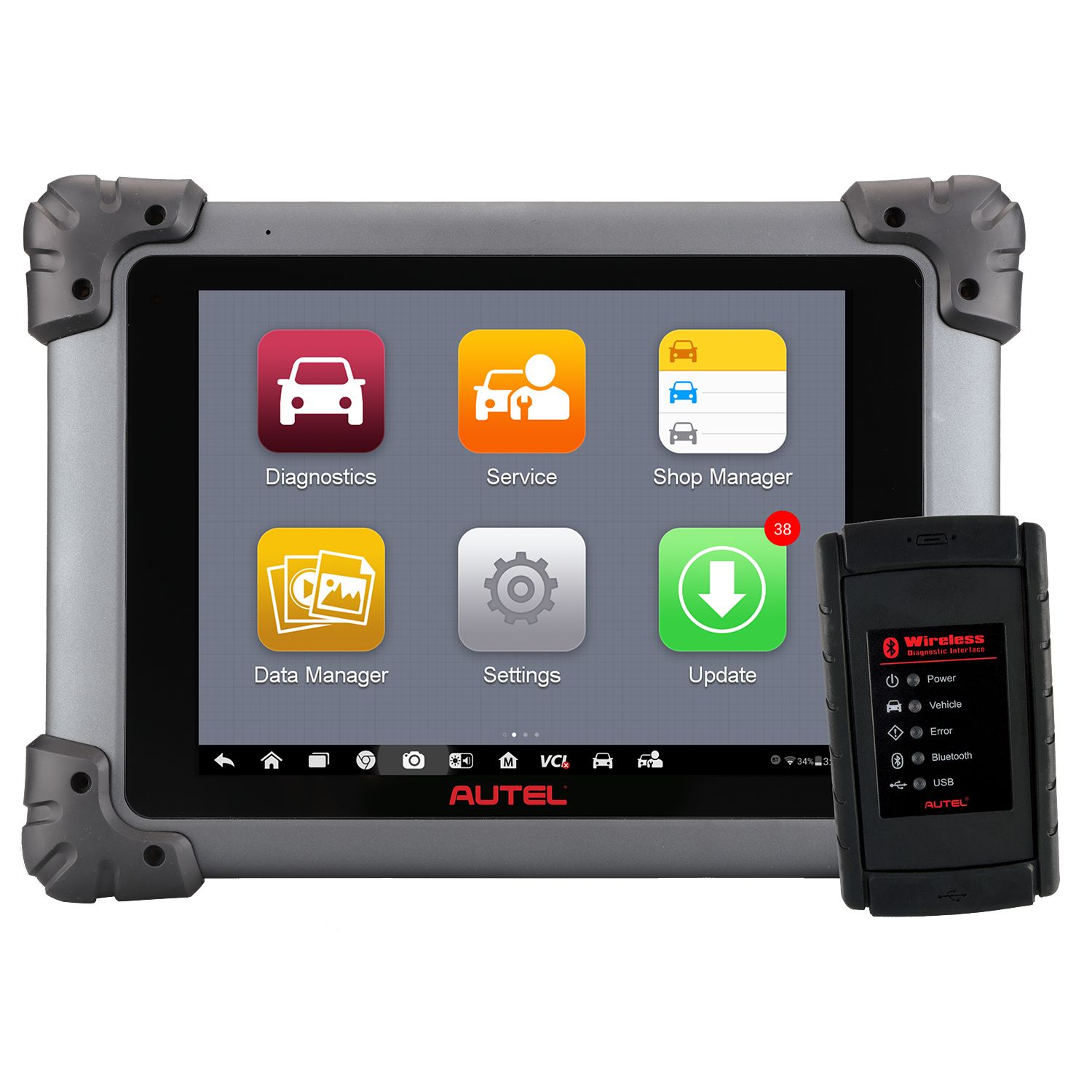 The MS908S is an advanced, wireless, diagnostic scan tool. The 9.7-inch touchscreen tablet comes equipped with an Android 4.4.2 operating system, a 1.3GHz + 1.7GHz hexa-core processor, 64G hard drive, and the Autel MaxiSYS system suite software. The MS908S has bi-directional control, can access all modules in all systems, and performs AutoSCAN and AutoVIN (2006+). The MS908S features advanced coding and adaptations, generates printable diagnostic reports and currently has 21 service functions including ABS brake bleed. It can reset diesel emissions and perform diagnostics on select light and medium duty vehicles. The MS908S is updatable via Wi-Fi, and includes a MaxiSYS-VCI unit and complete OBDII connector kit. A 1-year tool warranty and 1 year of free software updates are available with purchase. This tool is eligible for TCP expanded coverage.