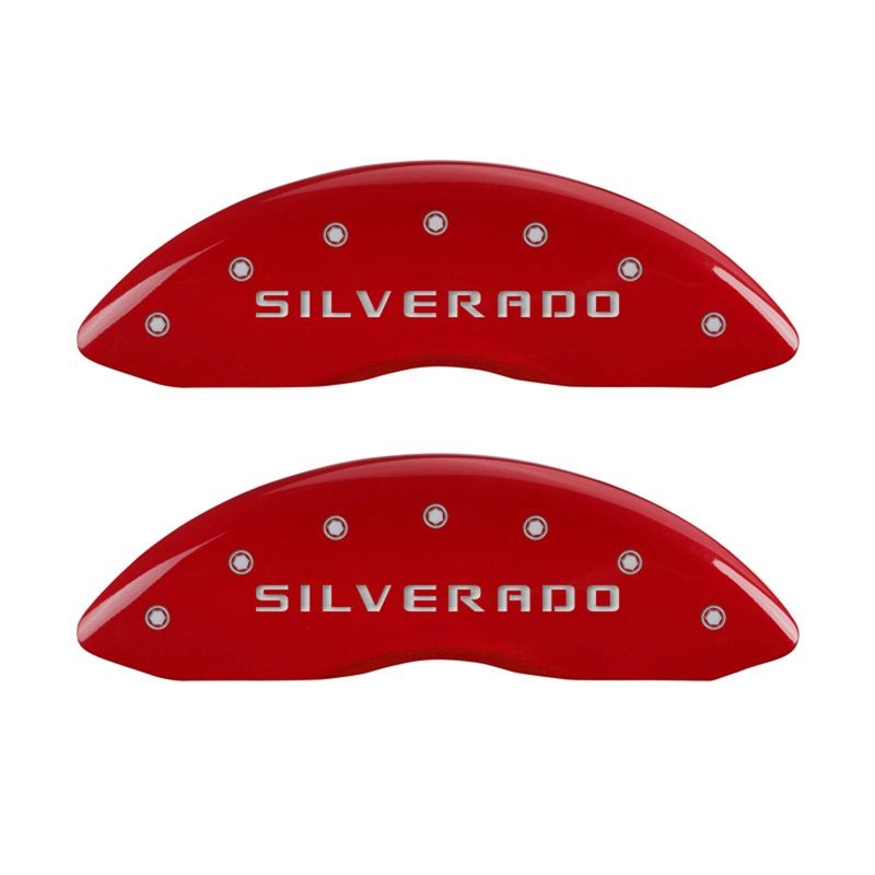 Front set 2 caliper covers, Engraved Front: Silverado, Red powder coat finish, silver characters.