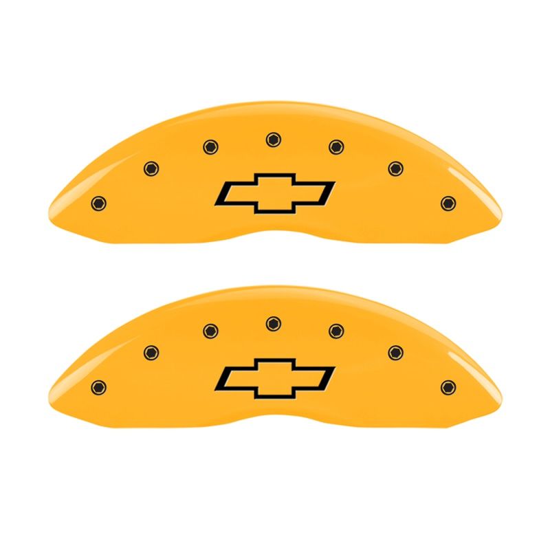 Front set 2 caliper covers, Engraved Front: Bowtie, Yellow powder coat finish, black characters