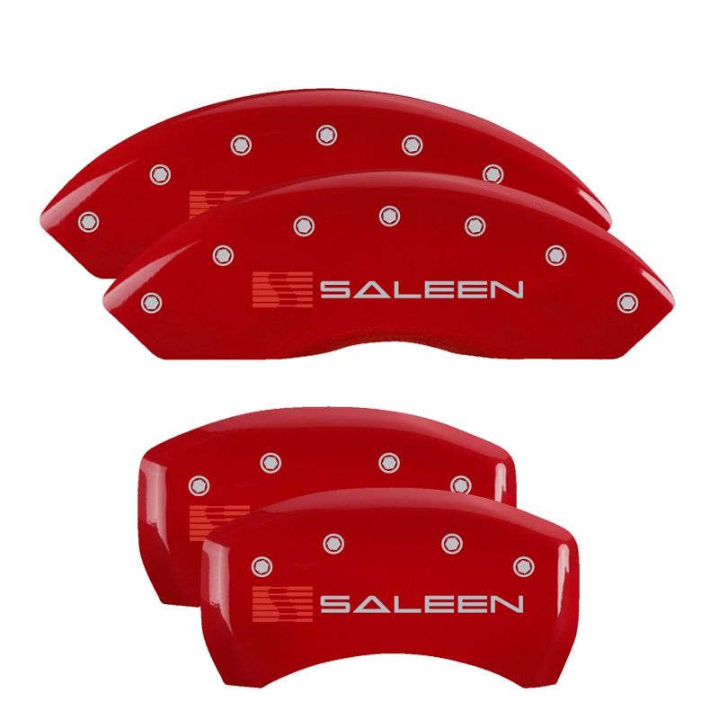 Set of 4 caliper covers, Engraved Front: Saleen – Engraved Rear: Saleen, Red powder coat finish, silver characters