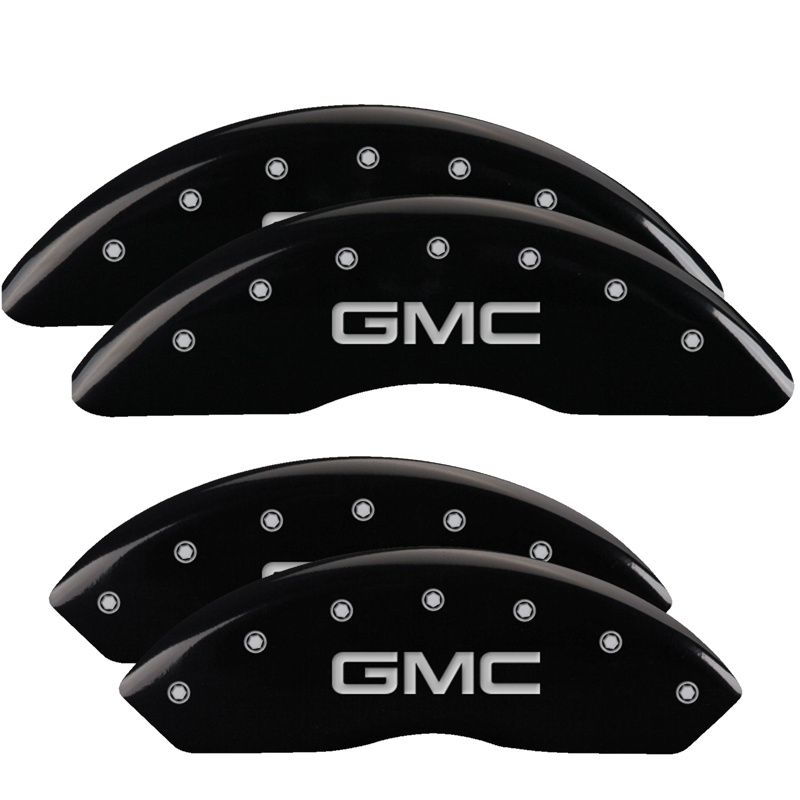 Set of 4 caliper covers, Engraved Front and Rear: GMC, Black powder coat finish, silver characters.