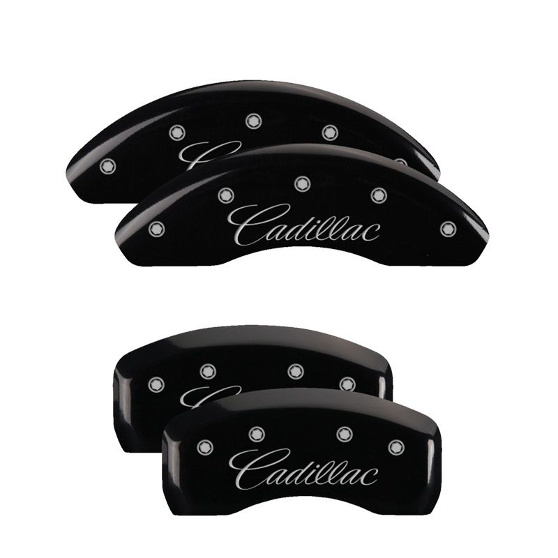 Set of 4 caliper covers, Engraved Front and Rear: Cursive/Cadillac, Black powder coat finish, silver characters.