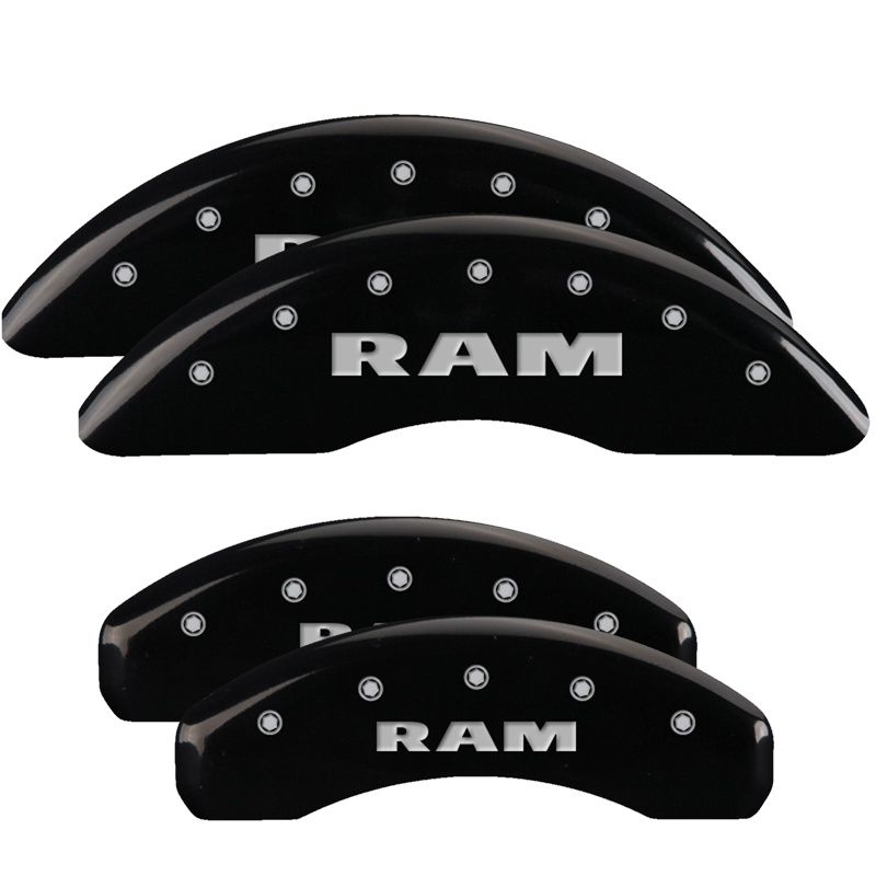 Set of 4 caliper covers, Engraved Front and Rear: RAM, Black powder coat finish, silver characters