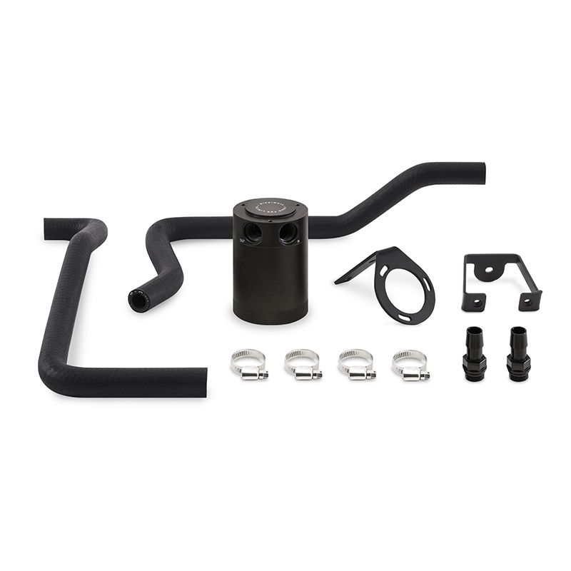TechSpec Includes: (1) Compact Baffled Oil Catch Can–(1) Application-Specific Mounting Bracket–(2) Direct-Fit Hoses, Black–(4) High-Quality Worm Gear Clamps–(2) CNC-machined Aluminum Barbed Fittings–Mishimoto Lifetime Warranty