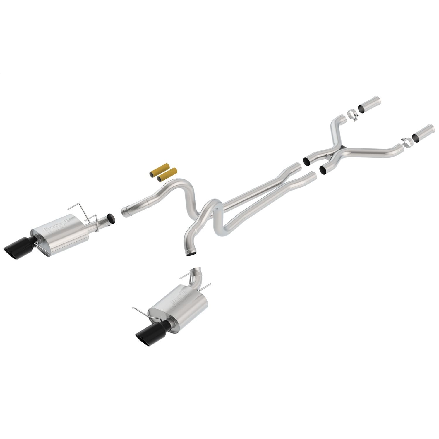 System contains a merge X-Pipe for increased performance and improved sound. This system features a black chrome finish on T-304 stainless steel tips. Using Borla(r) Stainless Steel Polish p# 21461 is NOT recommended with these black chrome tips. We suggest cleaning the tips with hot water and a microfiber cloth. Borla(r) Cat-Back(tm) and Axle-Back exhaust systems feature patented straight-through and multi-core technology designed to unleash hidden horsepower. Increased exhaust velocity adds power, driving excitement, fuel economy, and the distinctive Borla(r) Sound of Power respected by motoring enthusiasts everywhere. Each system is built from premium T-304 stainless steel, superior to T-400 series knockoffs (such as 409), to give you the absolute best in performance and durability. Ultra-smooth mandrel bends ensure maximum flow& power, and precision computer-controlled CNC manufacturing ensures an accurate fit. Best of all, Borla(r) stands behind every system with a Million-Mile Warranty. Just what you'd expect from the world's most experienced (and most winning) exhaust brand. System ships in 2 boxes.