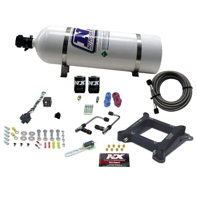 The Gemini plate system is the most technically advanced single stage plate ever designed. The unique direct-port pattern assures you perfect nitrous-fuel distribution. It solves problems commonly found on single plane manifolds, particularly small and big block Fords. This new innovation provides superior distribution and outstanding atomization. With no spray bars to sag, split, block airflow, or damage this is truly the ?Next Generation in nitrous plate technology. This Stage 6 system includes jetting for 50, 100, 150, 200, 250 & 300HP and includes a 15lb nitrous bottle, limited lifetime warranty Lightning solenoids, heavy duty 40 amp relay, stainless bottle brackets, and extra 4AN long supply line (Race Hose). Fits standard 4150 flange carburetors.