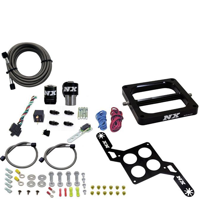The conventional RNC (Restricted Nitrous Class) systems are the first choice for professional racers that are limited by jet size. These systems feature a CNC billet nitrous plate with enlarged nitrous passages, a .250 orifice Lightning 250 nitrous solenoid, 8an feed line and a .500 orifice DF5 bottle valve. The combination of these components results in a very dense liquid nitrous charge which allows the maximum amount of nitrous flow through a certain size jet. Results of these RNC systems are so impressive that you will have to use one to believe it. This systems includes a Lightning series fuel solenoid, stainless hard lines to connect the solenoids to the plate, heavy duty relay, switches, stainless bottle brackets and every nut, bolt and electrical connector needed to complete the installation.