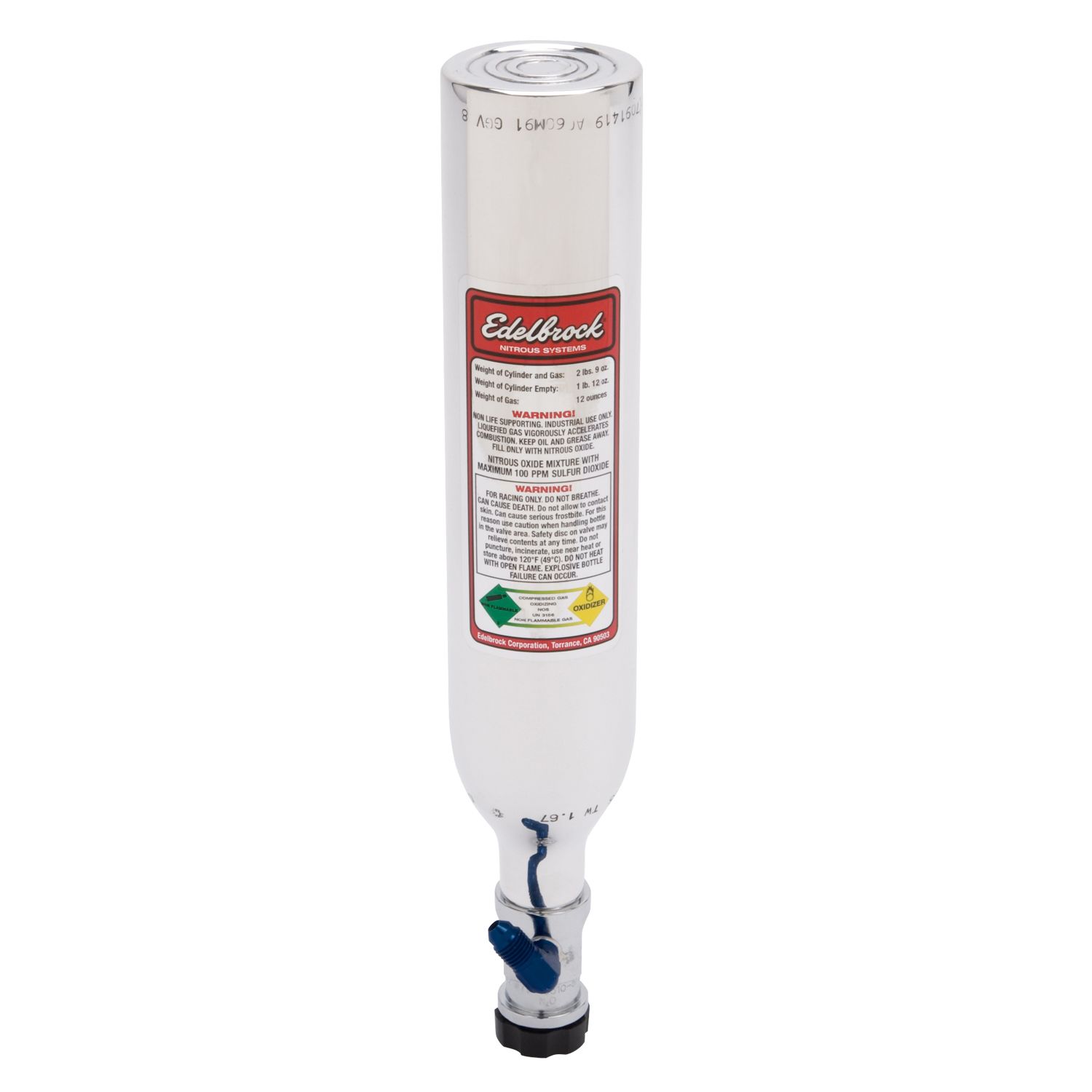 Edelbrock Nitrous Bottle #72470 is made from aluminum alloy and has a 12 oz. capacity. It features a venting system to prevent pressure increases beyond the safety level and is D.O.T. approved. This bottle has a polished finish.