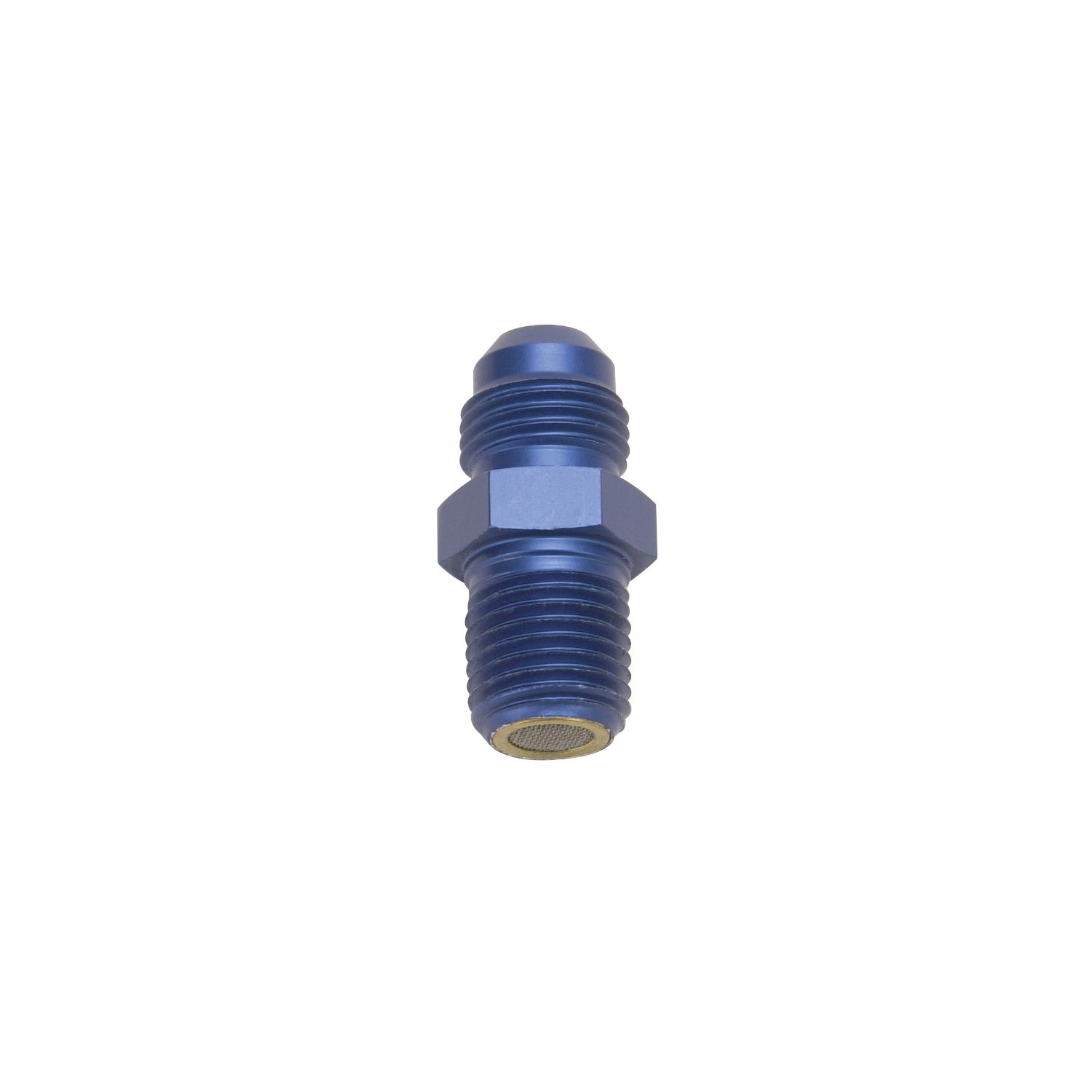 Russell Filter Fitting #76515 has -6 AN to 1/4" NPT straight design. It is made from high quality aluminum and has a blue anodized finish.