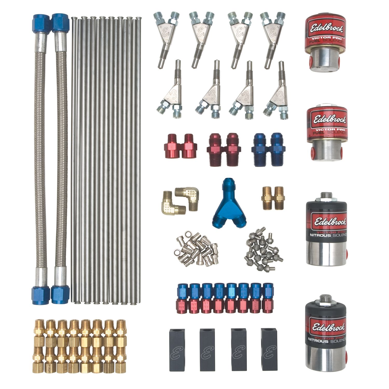 Edelbrock Custom Direct Port Plumb Kit #71851 is designed for use on modified V-8 engines. This is one of our most sophisticated nitrous systems allow you to tune each individual cylinder for superior performance! Includes our Victor Pro Nitrous Solenoids, stainless steel lines, stainless steel jets and most hardware to complete the installation. This kit utilizes our E2 nozzles for serious competition with power increases of up to 300 horsepower or more. For racers with an existing system, our manifold Plumb Kits include everything to plumb a manifold only (no wiring harness, relays, or thread tap).