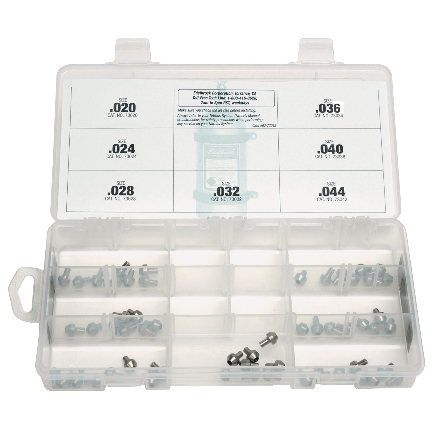 Edelbrock Super Victor Direct Port Jet Pack #73012 was developed for the Super Victor Direct Port Nitrous Systems. Includes total of eight of each 0.020", 0.024", 0.028", 0.032", 0.036", 0.040" and 0.044" for a total of 56 jets. Edelbrock CNC-machined stainless steel jets won't erode like brass jets and maintain precise dimensions for accurate and safe hp gains. Use this kit to fine tune your nitrous system for maximum performance. Will also work with most other brands of nitrous systems (except NX).