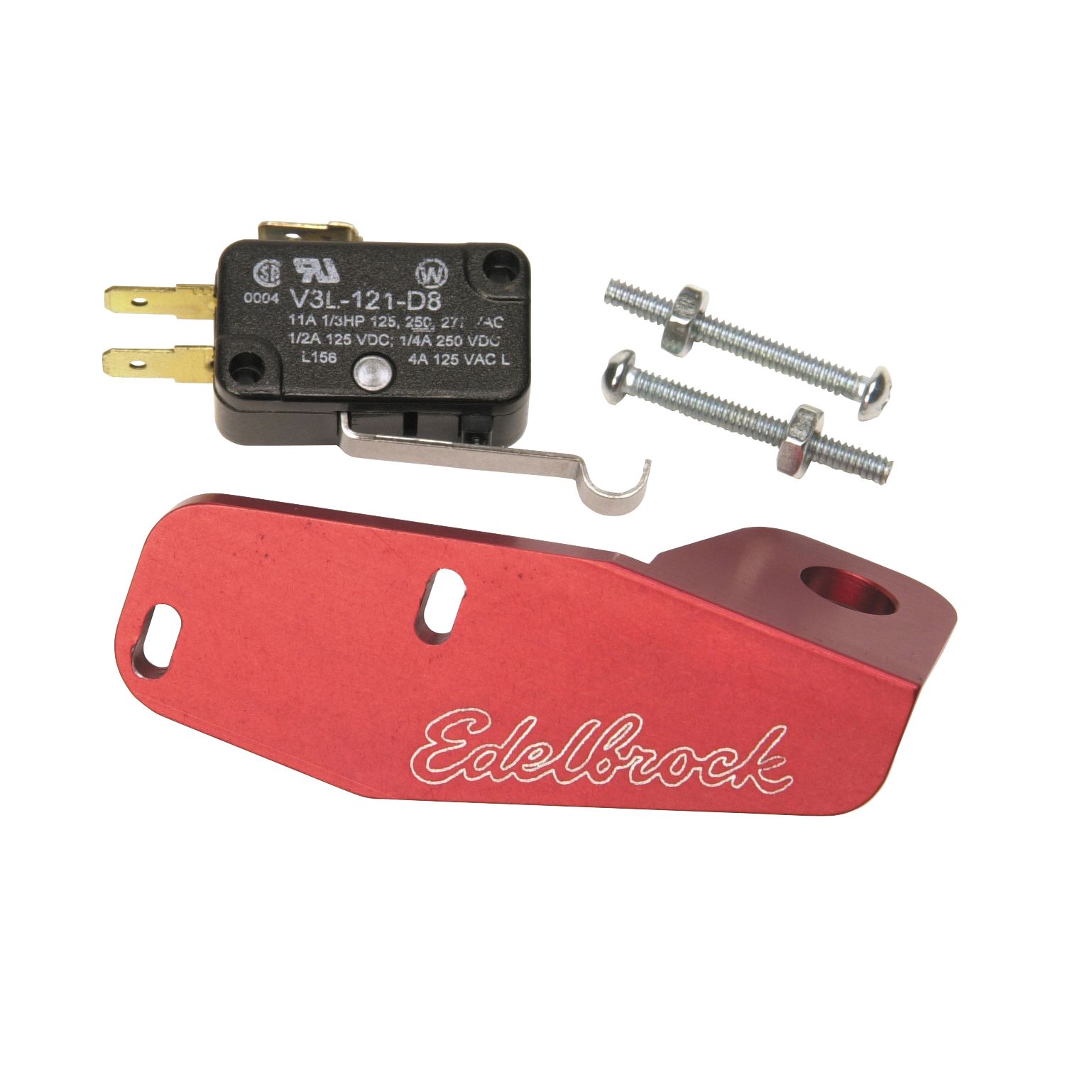 Edelbrock Nitrous Microswitch and Universal Bracket Kit #72281 is for use with Holley 4500 Series carburetors. Kit includes a snap-action microswitch, mounting hardware and a CNC-machined red anodized billet aluminum bracket.