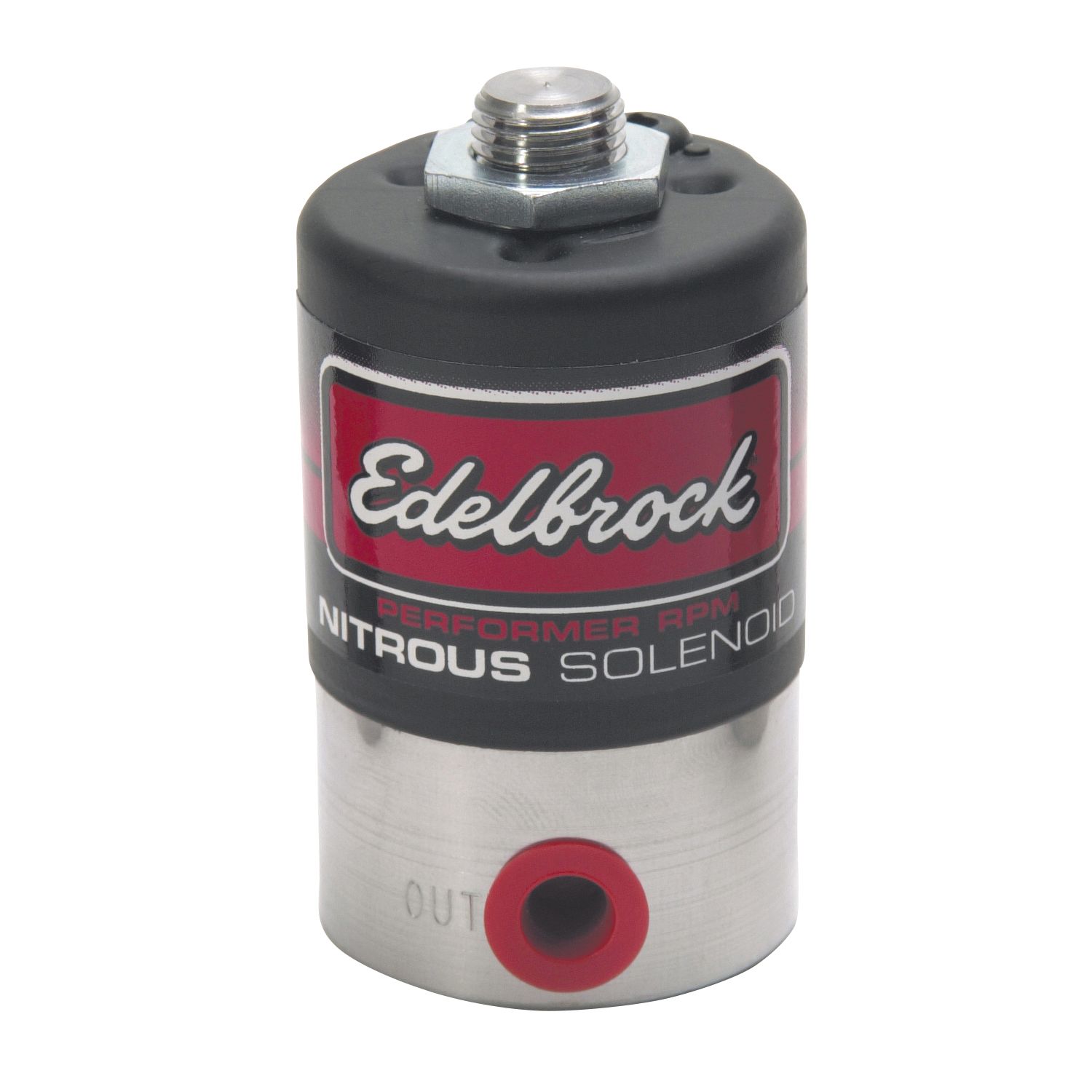 Edelbrock Performer RPM Nitrous Solenoid #72001 is made from stainless steel for corrosion resistance and has a low amp draw. It features tighter tolerances, a low current consumption coil and a Teflon plunger for reliability and longevity. The coil cover is powder coated durability. Supports up 400 horsepower and has 1/4" NPT inlet with a 1/8" NPT outlet.