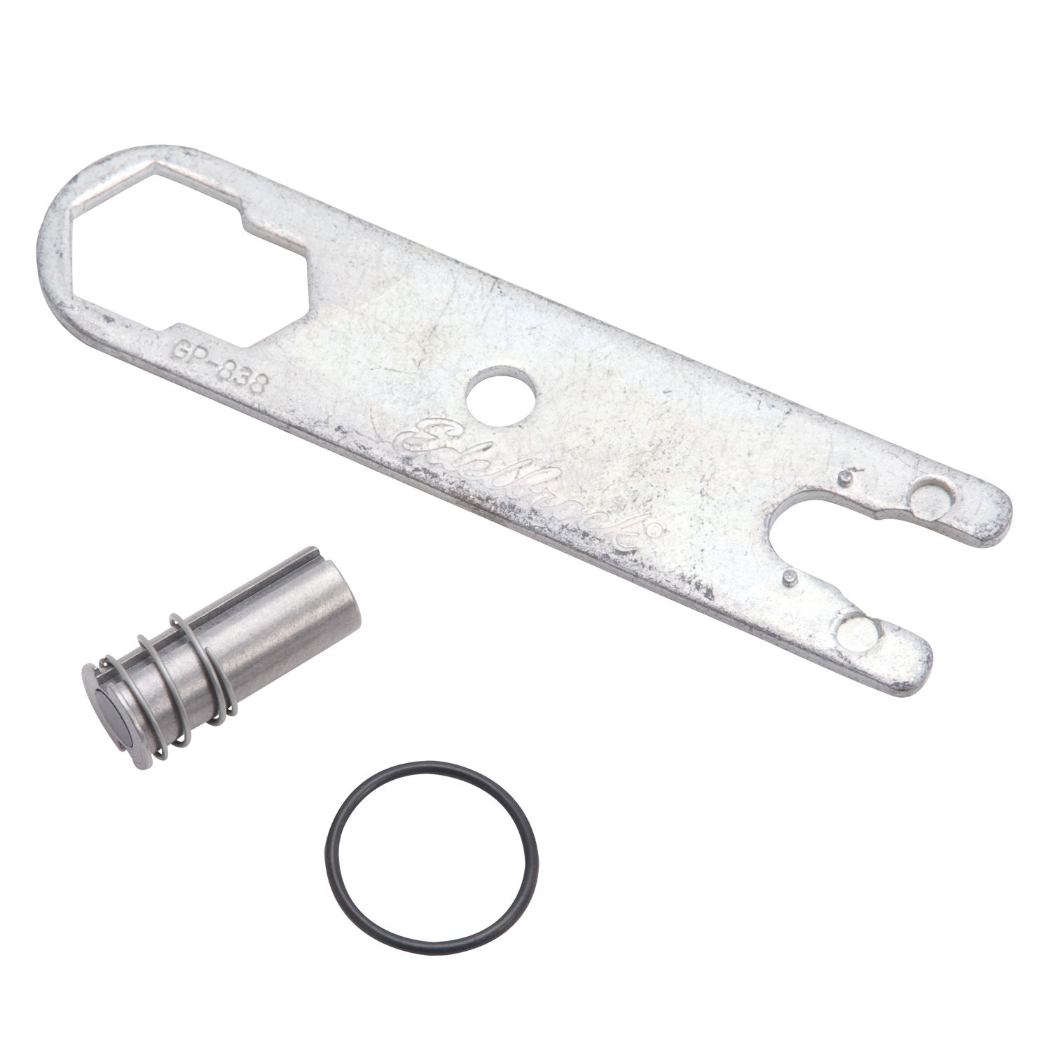 Edelbrock Performer Fuel Solenoid Rebuild Kit #72201 includes a Teflon plunger, O-ring, plunger spring, and stem wrench. Replacement coils sold separately.