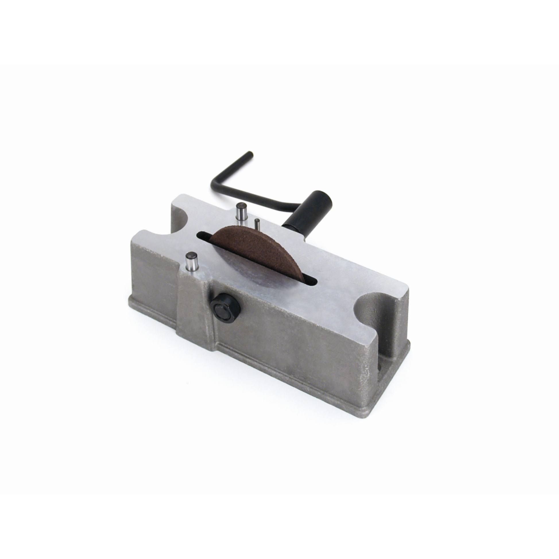This ring filer is designed to clamp to your workbench and uses a hand crank to turn the carbide wheel.
