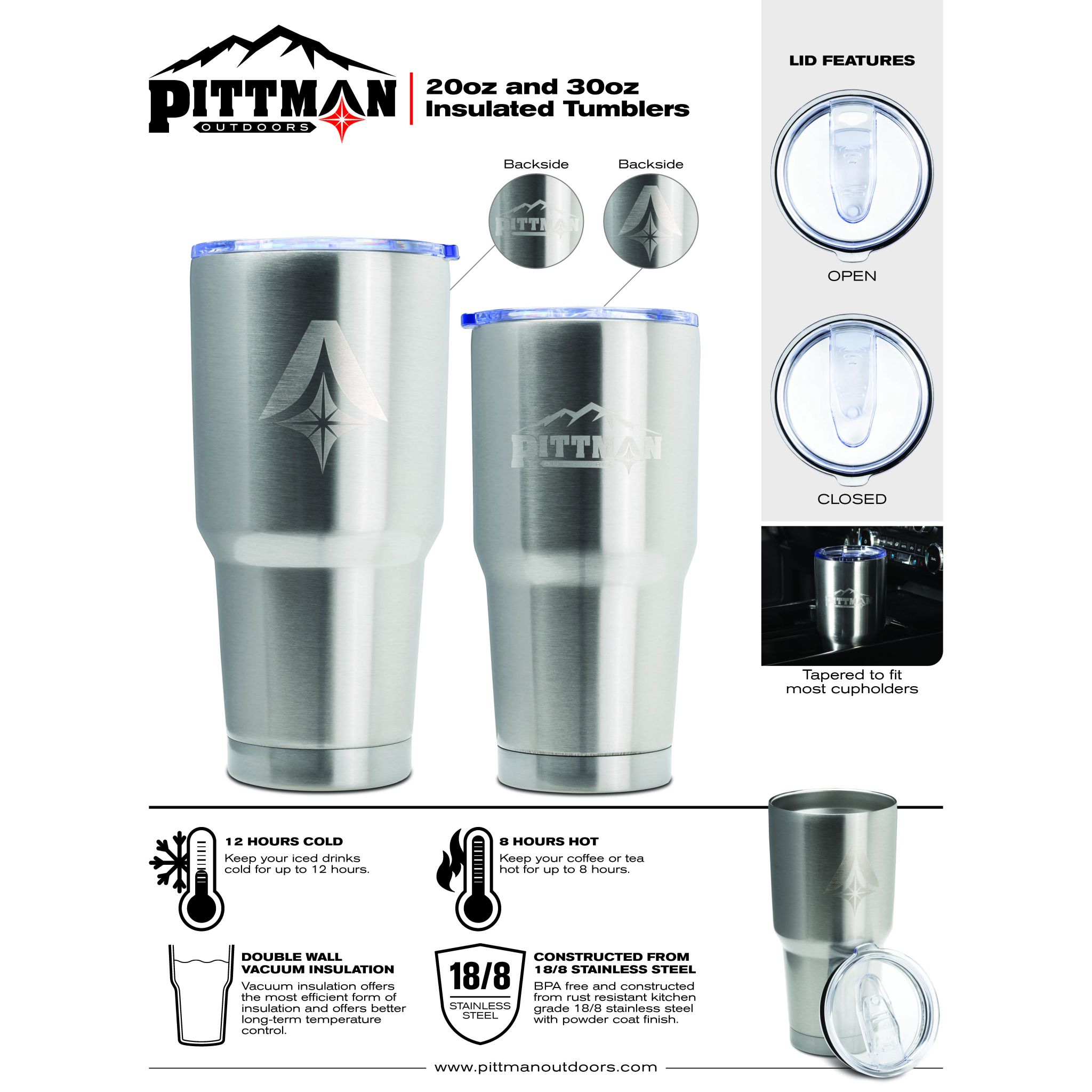 Our 30 oz / .88 L Pittman Outdoors double wall vacuum insulated tumblers are constructed from 18/8 kitchen grade stainless steel. The tapered bottom easily fits most cupholders. BPA free, they are perfect for keeping you hydrated all day.