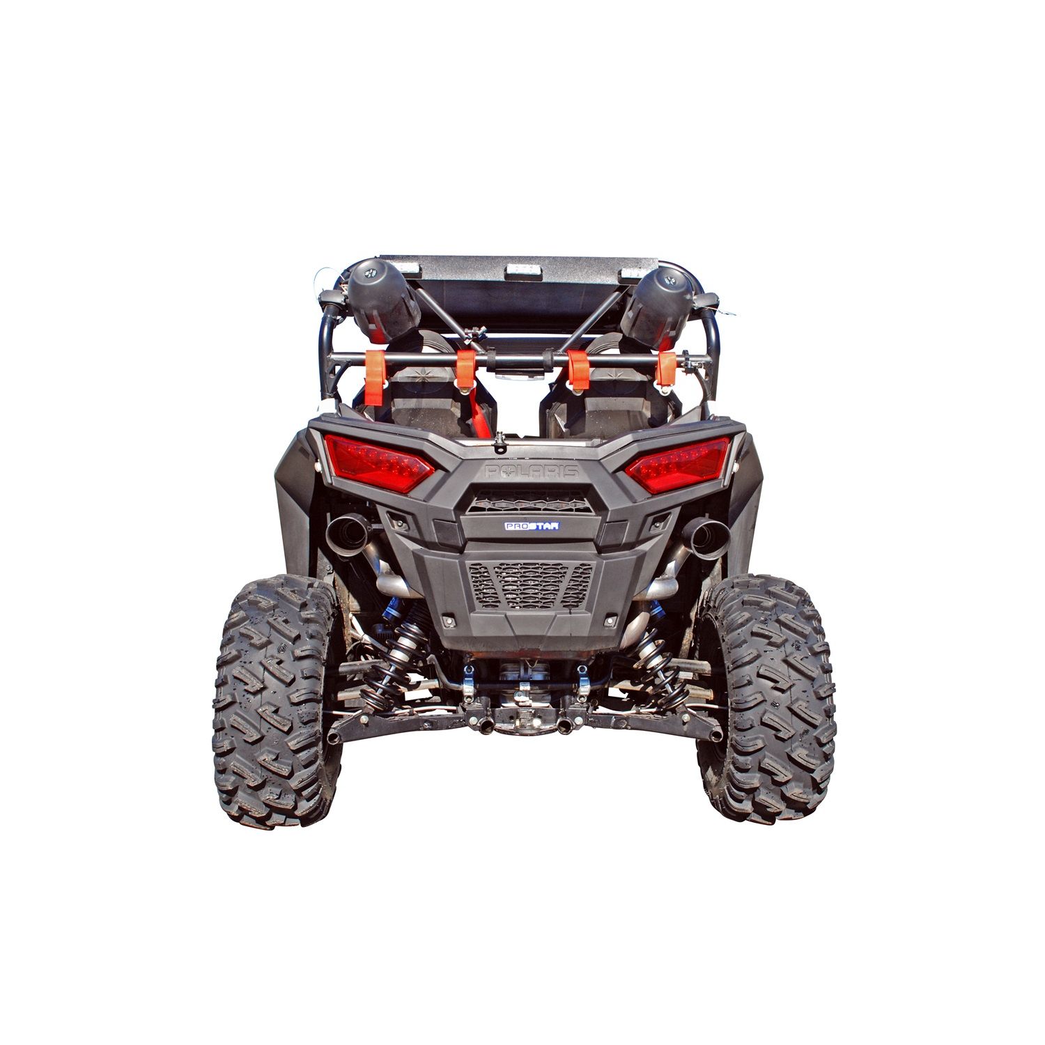 Compliment your Polaris Ranger RZR 900S with Gibson Twin Rear Exit Exhaust. Get an extra increase of 2-4 rear wheel horsepower, 3-5 more foot pounds of torque. With Gibson non-packed mufflers you can guarantee a consistent level of sound and performance quality for the duration of your vehicles lifetime. Utilizing a compression spring fitting allows plenty of movement to handle all types of abuse eliminating the possibilities of breakage, Finished with a set of T-304 polished stainless intercooled tips. All necessary hardware is included for a complete hassle free bolt on installation. Tested with a decibel reading of 96 dbs per the SAEJ 1287 testing procedure. USFS Approved Spark Arrestor