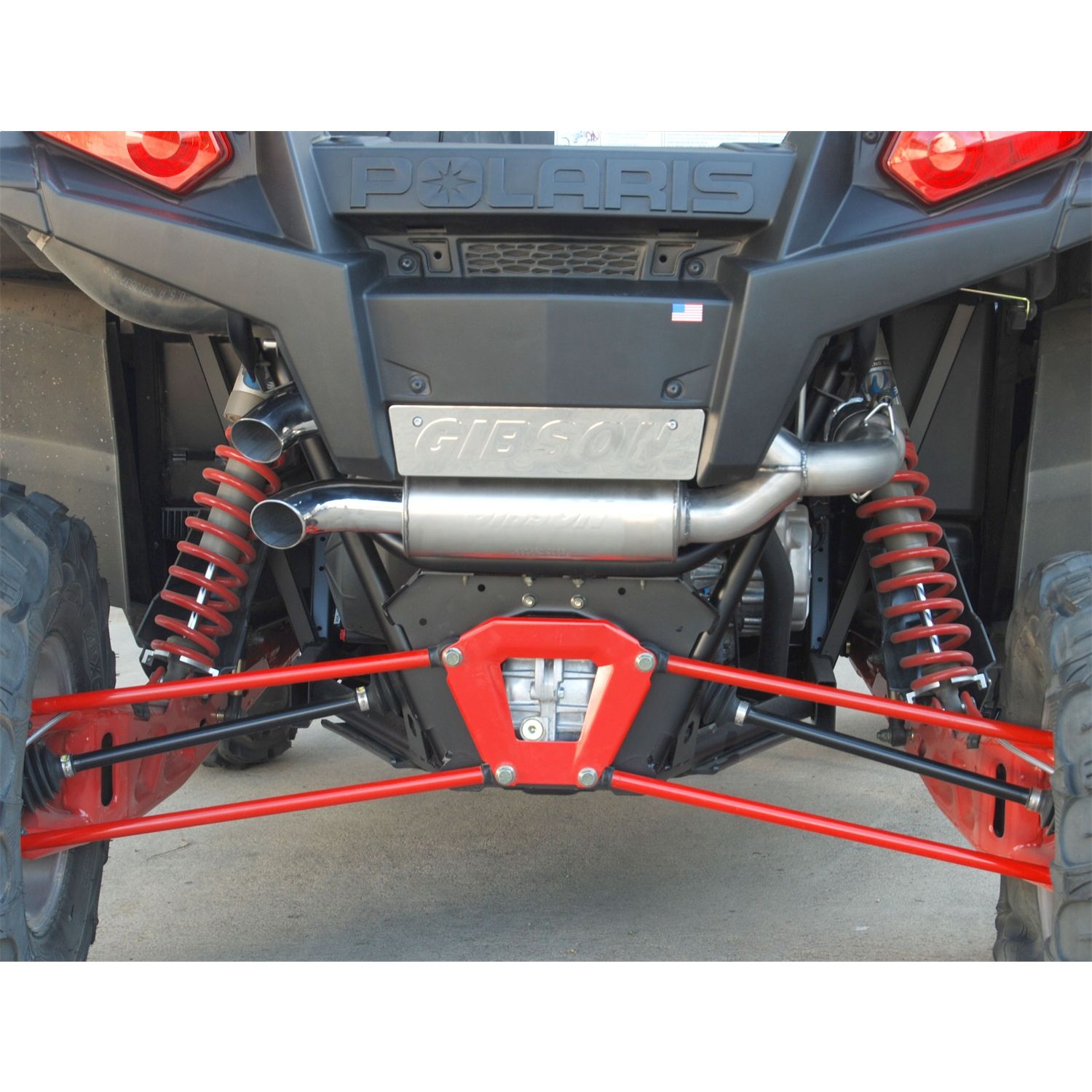 Compliment your Polaris Ranger RZR XP 900 with Gibson Twin Core Slip on Exhaust. Get an extra increase of 5-6 rear wheel horsepower, 4-5 more foot pounds of torque and 2-3mph. With Gibson on-packed mufflers you can guarantee a consistent level of sound and performance quality for the duration of your vehicles lifetime. Utilizing a compression spring fitting allows plenty of movement to handle all types of abuse eliminating the possibilities of breakage, finishing with a mirror bright polished T304 Stainless exhaust turndown tip. All necessary hardware is included for a complete hassle free bolt on installation. Tested with a decibel reading of 101dbs per the SAEJ 1287 testing procedure. USFS Approved Spark Arrestor. Made in the USA.
