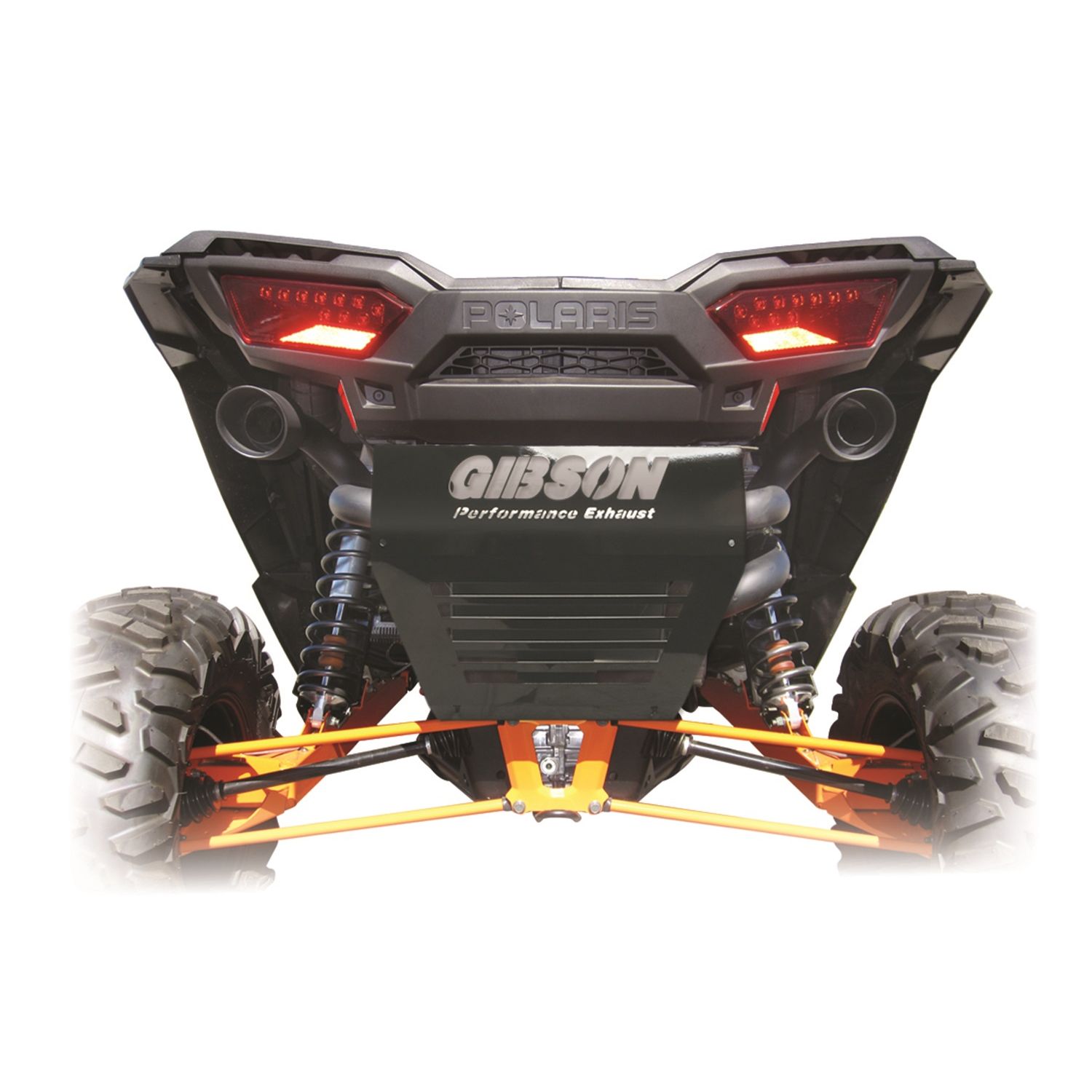 Compliment your Polaris Ranger RZR XP 1000 with Gibson Twin Rear Exit Exhaust. Get an extra increase of 2-4 rear wheel horsepower, 3-5 more foot pounds of torque and 2-3mph. With Gibson non-packed mufflers you can guarantee a consistent level of sound and performance quality for the duration of your vehicles lifetime. Utilizing a compression spring fitting allows plenty of movement to handle all types of abuse eliminating the possibilities of breakage, Finished with a personalized powder coated rear beauty plate and a complete black Ceramic Exhaust and intercooled tips. All necessary hardware is included for a complete hassle free bolt on installation. Tested with a decibel reading of 96 dbs per the SAEJ 1287 testing procedure. USFS Approved Spark Arrestor. Made in the USA.