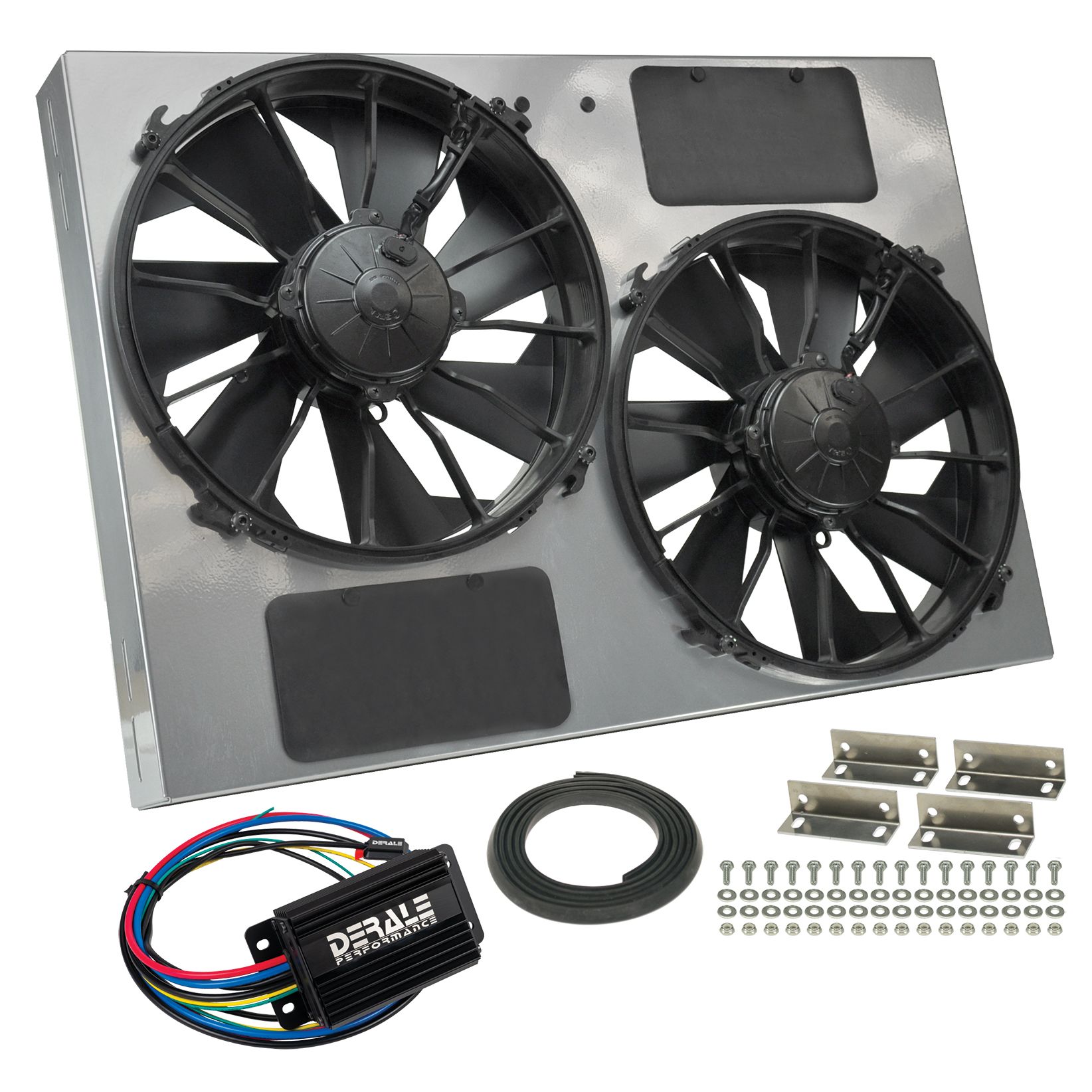 Get complete control of your engine temperature! Derale Performance has combined their high-performing shrouded Powerpacks with the ultimate fan controller. Using high output electric fans incorporated into an engineered shroud, this Powerpack can conquer even the most difficult cooling conditions. This unit features a Steel Powdercoated shroud measuring 26" wide by 18" top to bottom and is only 4" in overall depth to offer an adjustable yet precision fit. The dual 12" high output electric fans are some of the most proven and reliable fans in our line-up and are specifically designed to thrive on thick, tight fin radiator cores. Offering a total of 4000 CFM, this dual electric fan assembly generates the most real-world airflow in the smallest package on the market. Now add the PWM Fan Controller with built-in soft start technology. The controller utilizes Pulse Width Modulation to constantly adjust electric fan speeds from 0-100%, maintaining the optimal engine operating temperature. No more reacting to the engine temps, you can control it! This allows electric fans to operate at the percentage needed, instead of 100% all the time, therefore increasing component life and eliminating amperage spikes.