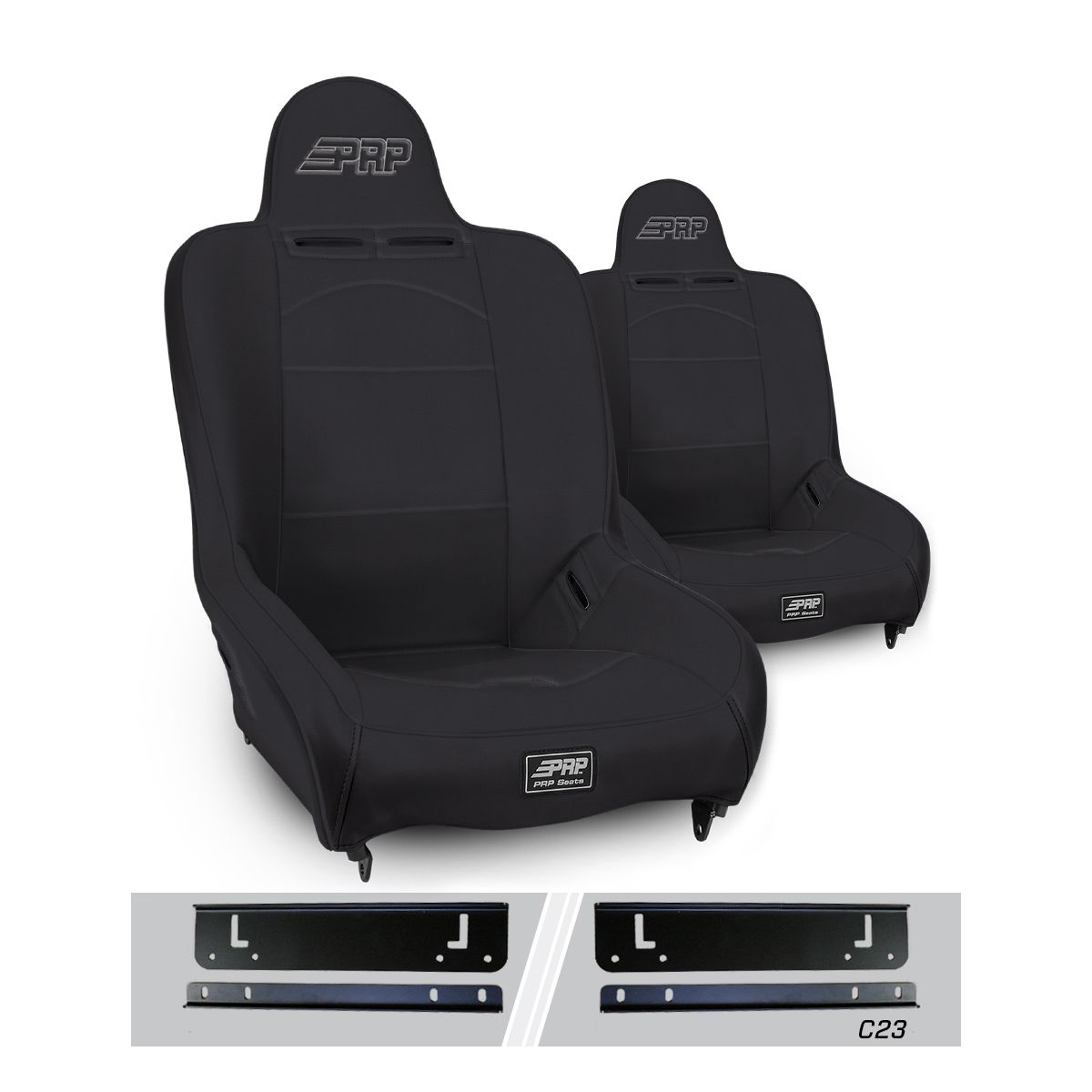 Add more comfort and containment to your Jeep Wrangler TJ. With 7" of containment, the Premier is PRP's versatile, all-around, off-road suspension seat. A great classic seat for Jeeps, buggies, trail rigs, and prerunners. Medium level containment on the sides keeps you secure when the ride gets rough, but still makes it easy to get in & out of the vehicle. The vinyl-coated nylon suspension liner and dual-density foam decrease the impact on the body, reducing the fatigue you feel after a long day in the dirt or dunes. The seat features Tweed Center, Vinyl Back and Vinyl Piping. This kit comes with 2x Premier Seats, and the adapter mounts to fit into your Jeep Wrangler TJ (1997-2002). The adapter mounts bolt to your OEM sliders, allowing you to install the seat while retaining the ability to slide back and forth. Seat Dimensions: 31? Tall x 21? Wide x 26? Deep Fitment Jeep Wrangler TJ (1997-2002) Note: *Seat height is typically 2" higher than stock seats. Made for Off-Road use only with 4pt or 5pt off-road harnesses. Passenger Seats may not retain the ability to tumble. 3pt Seat Belts will need a Seat Belt Extension/Angle Bracket.