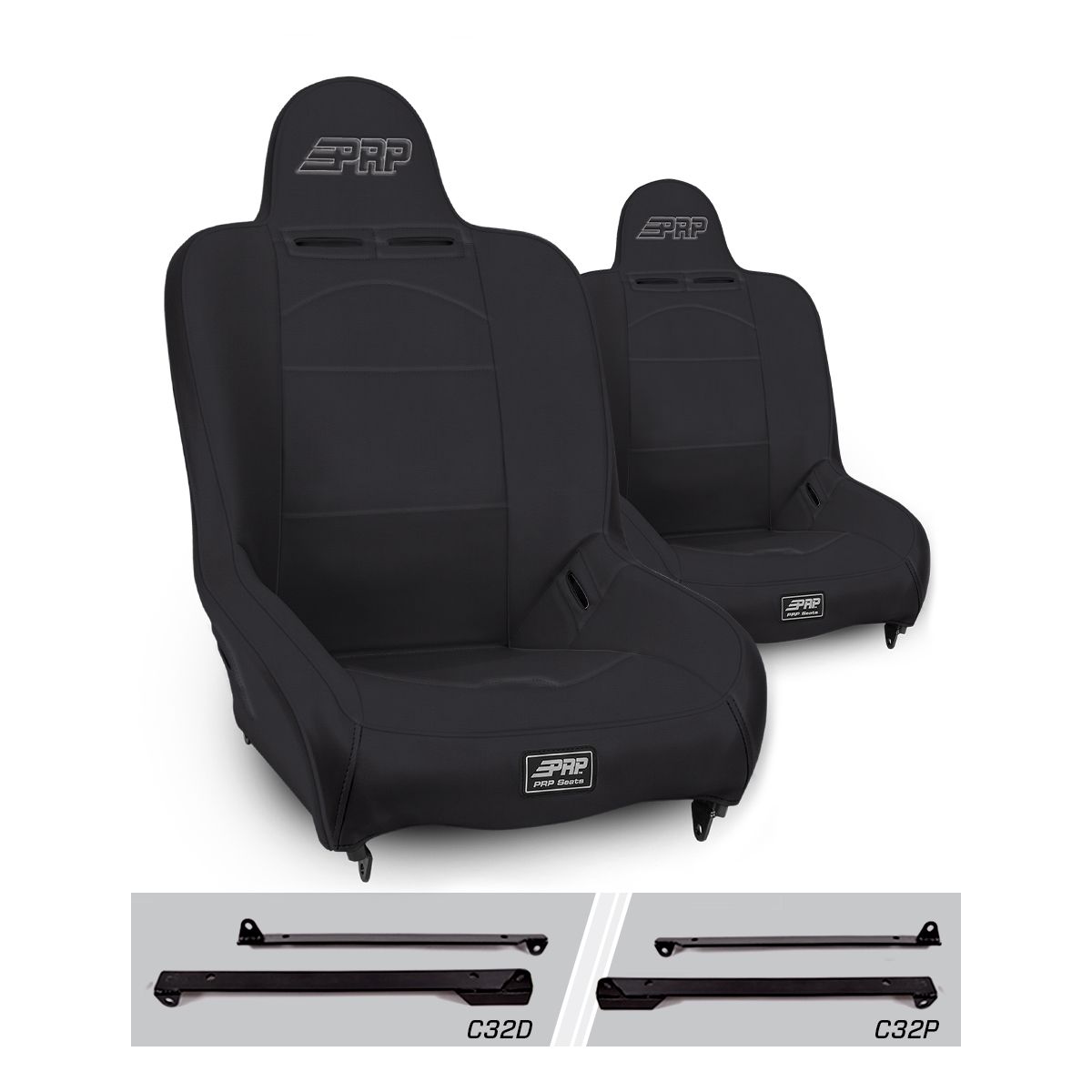 Add more comfort and containment to your Jeep Wrangler CJ7/YJ . With 7" of containment, the Premier is PRP's versatile, all-around, off-road suspension seat. A great classic seat for Jeeps, buggies, trail rigs, and prerunners. Medium level containment on the sides keeps you secure when the ride gets rough, but still makes it easy to get in & out of the vehicle. The vinyl-coated nylon suspension liner and dual-density foam decrease the impact on the body, reducing the fatigue you feel after a long day in the dirt or dunes. The seat features Tweed Center, Vinyl Back and Vinyl Piping. This kit comes with 2x Premier Seats, and the adapter mounts to fit into your Jeep Wrangler CJ7/YJ. The adapter mounts bolt to your OEM sliders, allowing you to install the seat while retaining the ability to slide back and forth. Seat Dimensions: 31? Tall x 21? Wide x 26? Deep Fitment Jeep Wrangler CJ7 Jeep Wrangler YJ Note: *Seat height is typically 2" higher than stock seats. Made for Off-Road use only with 4pt or 5pt off-road harnesses. Passenger Seats may not retain the ability to tumble. 3pt Seat Belts will need a Seat Belt Extension/Angle Bracket.