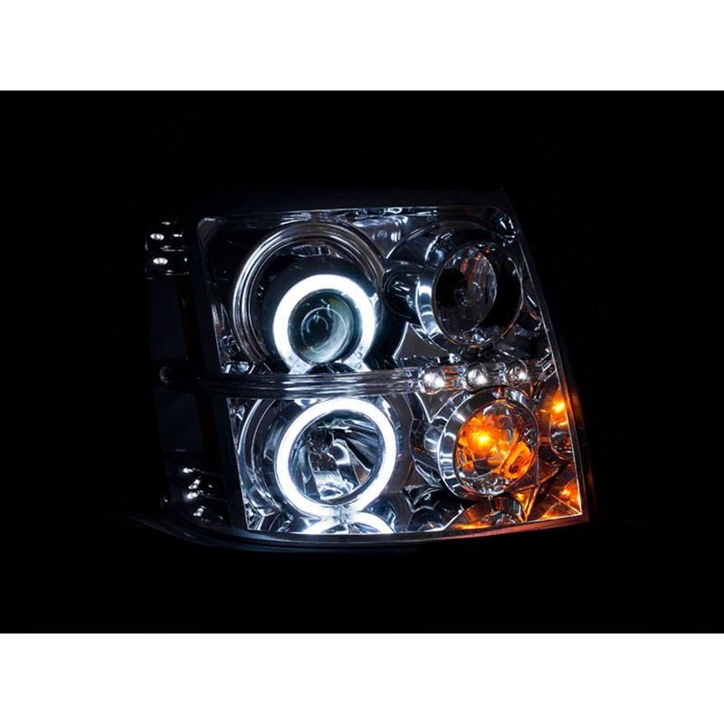 Projector Headlight Set, w/Halo, Clear Lens, Chrome Housing, Pair, CCFL, HID Compatible Guaranteed To Improve Your Vehicles Appearance. Rigorously Tested For Fit And Function. Simple Plug And Play. No Modifications Required. Easy Installation Using Common Hand Tools. Uses Stock Mounting Locations And Hardware. D.O.T. Compliant To S.A.E. Standards. Sold As A Pair. Will Only Fit Models With Factory HID Bulbs.