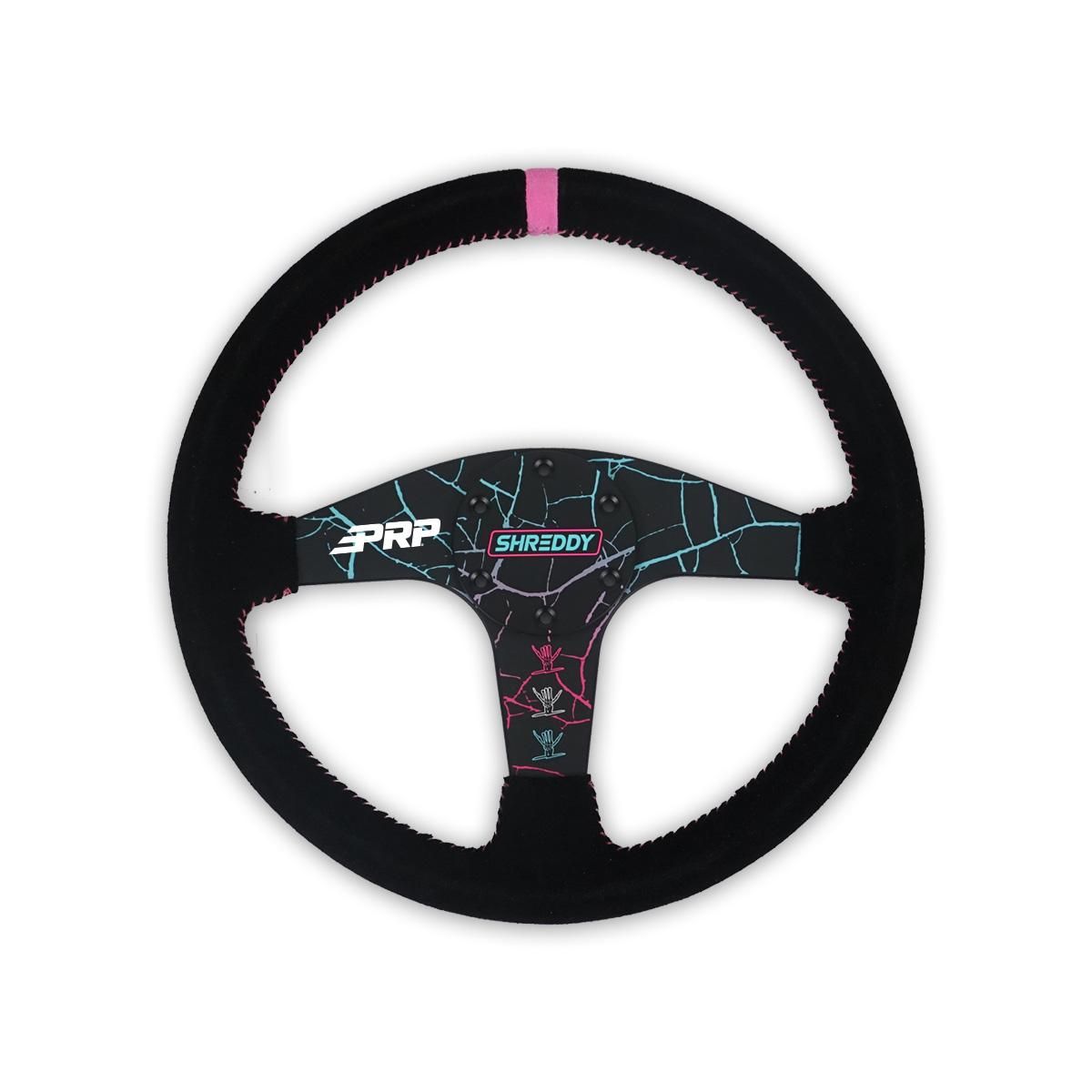 Introducing another epic collaboration between SHREDDY LYFE & PRP Seats. This Cracked Flat Dish Steering Wheel features a black suede band for superior grip, the Shreddy Cracked pattern on the spokes, and of course the classic bones shaka logos. These are very limited, so don't hesitate! Get'em now! PRP’s Steering Wheels are Built for Off-Road. Constructed from high-strength aluminum for extra durability. The steering wheel has 6 point bolt pattern, specifically chosen because it fits the majority of aftermarket quick releases. 10/10 will make you shred more. Make sure to pair it up with our entire line of Cracked Seats, Storage Bags, and Harnesses. FEATURES Made from high-strength aluminum 6 Point Bolt Pattern – Most common in off-road industry quick release adapters. Durable, moisture-resistant Black Suede andPink Stitching Black Cracked pattern spokes Includes hub bolts MEASUREMENTS: Diameter – 13 inches Depth – 1.5 inches (Flat Dish) Weight – 2 lbs