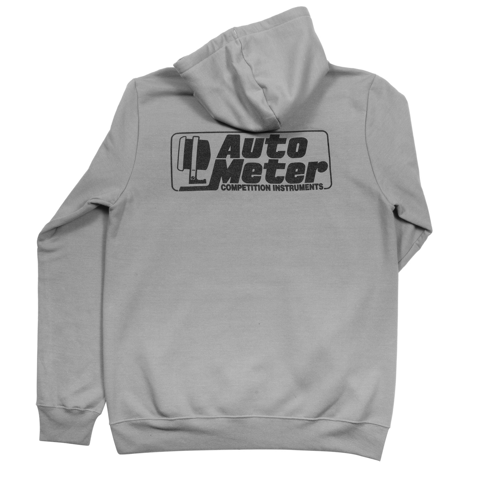 This gray fleece hoodie from AutoMeter will keep you toasty on those chilly mornings and evenings at the track. Features include a sewn fabric tag detail on left pocket, a screened black competition logo graphic on left chest, and large competition logo graphic on the back with contrasting black hood lining and drawstrings.