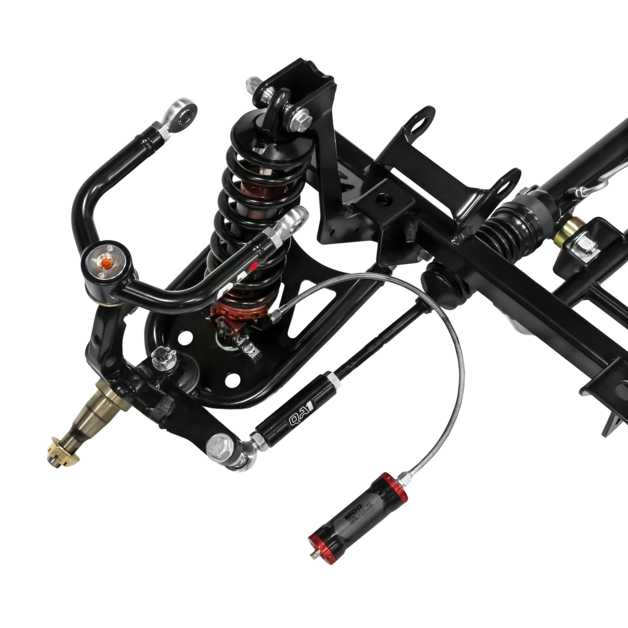 QA1 62-66 Mopar A-Body Front Coil-Over Conversion System , Convert your classic Dart, Demon, Duster or Valiant from torsion bar suspension to a QA1 coil-over system. Kits include a tubular K member for reduced weight and room for big-tube headers. Modular motor mounts offer many engine options-including Gen 3 Hemis. Systems easily bolt-in without any cutting or welding. QA1 tubular control arms and rack-and-pinion steering greatly improve drivability and performance while providing a modern feel. , , The MOD Series shocks provide peak performance on the track and drag strip, delivering the aggressive force curves required for top-tier pro touring and drag racing cars. These shocks maximize tunability with modular valve packs. You can dramatically change your valving in minutes without ever taking the shock off the car, losing/contaminating oil or worrying about your nitrogen charge. Kits are available in drag or handling configurations. Drag kits use rod ends on both upper and lower control arms to improve weight transfer by reducing deflection. They include a lighter spring rate to improve rear grip during hard launches. Drag kits offer 0"-2" of drop. Handling kits use poly bushings on lower control arms to provide improved cornering and reduced NVH. They incorporate a heavier spring rate for increased front-end stability. Handling kits are available with 0-2" or 2-4" of drop. , , Both kits can be paired with an optional QA1 front sway bar. QA1 systems are made in the USA. Fitment notes: Gen 3 Hemi power steering pumps require a pressure reducer and the installation of a power steering cooler. Coil-overs and control arms in this kit can NOT be used with other QA1 tubular products designed for torsion bar suspension. Kits use Mustang II spindles to provide plenty of brake options. Kits with 2"-4" of drop require wheels to be least 18" in diameter. Check with your brake manufacturer to verify wheel backspacing.,