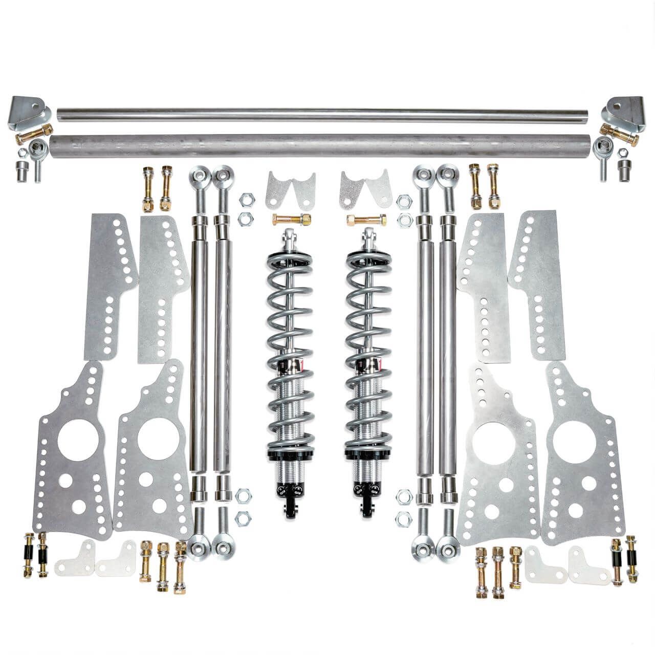 QA1 HD Pro Rear Drag 4-Link System includes brackets, trailing arms, diagonal link kit, hardware, tube adapters, QA1 rod ends, QA1 coilovers, and shock crossmember to build a performance drag race style 4-link suspension.