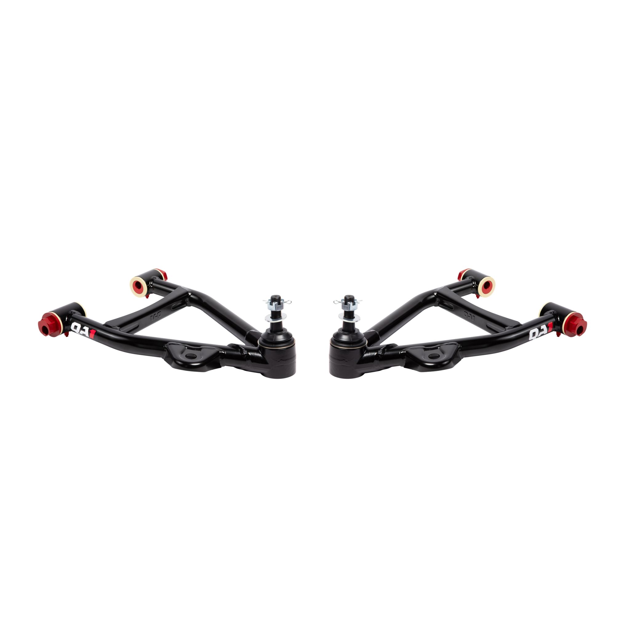 Product Overview QA1's Mustang race control arms are the perfect combination of performance and style, offering lightweight, durable construction and a clean, sleek design that will enhance the look of your Mustang. On-The-Car Adjustability QA1's unique eccentric adjustment sleeve allows for precise tuning of camber and up-to a 1/2 of track width adjustment without removing from the car, a feature not found in other control arms. Forged Ball Joint Housings A unique feature of the QA1 control arm is the forged ball joint housing. This provides exceptional reliability, strength, and durability. The low-friction ball joint ensures smooth operation, and the rebuildable, lightweight, and greaseable design makes maintenance a breeze. Ultra-Low-Friction Composite Bushings QA1's ultra-low-friction composite bushings are stiffer and provide bind-free movement, providing enhanced stability and control. They also allow for freer movement, resulting in a more responsive ride. Additionally, these bushings are much more durable than rubber bushings, making them highly resistant to wear and tear. Finally, composite bushings are greasable.for long life. Lightweight Design QA1 street control arms were designed to be the strongest, best looking control arms on the market. And weighing in at less than 8lbs per arm, this makes them among the lightest of street worthy control arms available. Easy, Bolt-In Installation Our commitment to thoughtful product design is evident in every product we produce, to deliver the highest level of performance at the track, while ensuring trouble-free compatibility. Made in the USA QA1 control arms are proudly made in Lakeville, Minnesota. Fitment Notes Control arms allow +/- 1/8 adjustment from factory length Compatible with factory and QA1 K-members Coilover struts required, not compatible with factory coil springs Fox Body control arms include adapter for SN95 spindles