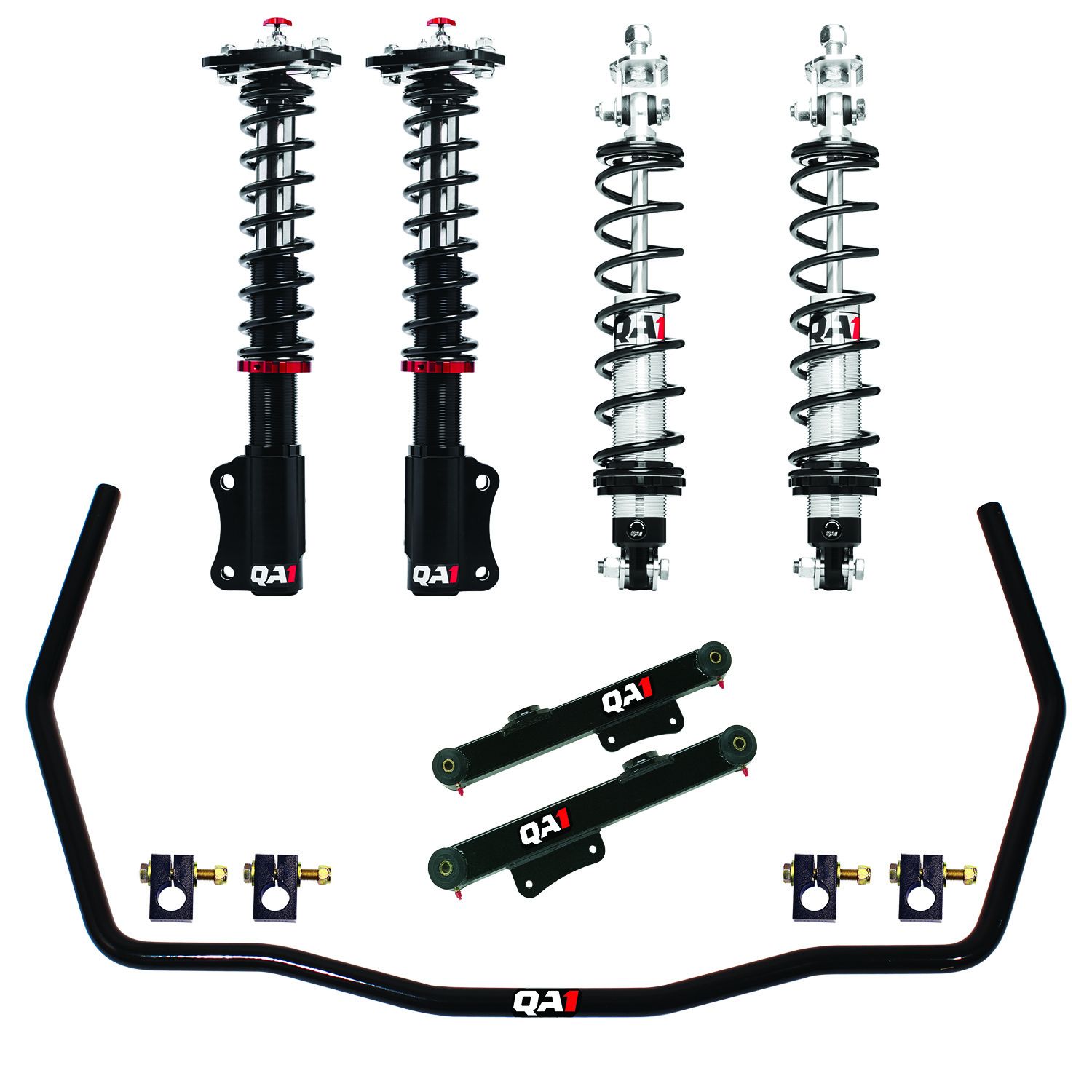 Product Overview The QA1 Level 1 Drag Race Kit is an ideal choice for street/strip Fox Body Mustangs. The kit includes lightweight double adjustable front struts, single adjustable rear coil-overs, boxed trailing arms, and rear sway bars. Inverted Front Struts and Rear Coil-Overs Front struts feature an inverted cartridge design, large diameter shaft, and lightweight aluminum body for improved suspension performance. The lightweight, high-travel springs with proven spring rates optimize weight transfer, reducing 60-foot times and ET's These kits offer up to 2" lower than stock ride height adjustment to dial in the perfect stance for your Mustang. Single-adjustable rear coilovers are a good option for track cars that also see a fair amount of street driving, offering a comfortable ride on the street with the ability to adjust for the track. Lightweight Caster Camber Plates Aluminum caster camber plates improve Mustang handling and performance. Lighter and sleeker than steel, they offer precision adjustment to fine-tune suspension geometry for straight line stability. Boxed Trailing Arms and Rear Sway Bar Boxed trailing arms are an essential upgrade for Mustangs, improving traction, and launch control. They solve flexing issues and reduce bushing bind, allowing the suspension to move more smoothly and provide better control. When paired with a rear sway bar, boxed trailing arms can help your Mustang launch straighter and have more control down track. Easy, Bolt-In Installation Our commitment to thoughtful product design is evident in every fully bolt-in kit we produce, to deliver the highest level of performance at the track, while ensuring trouble-free compatibility. Made in the USA QA1 struts, coilover shocks, and tubular suspension is proudly made in Lakeville, Minnesota. Fitment Notes Not compatible with Cobra IRS