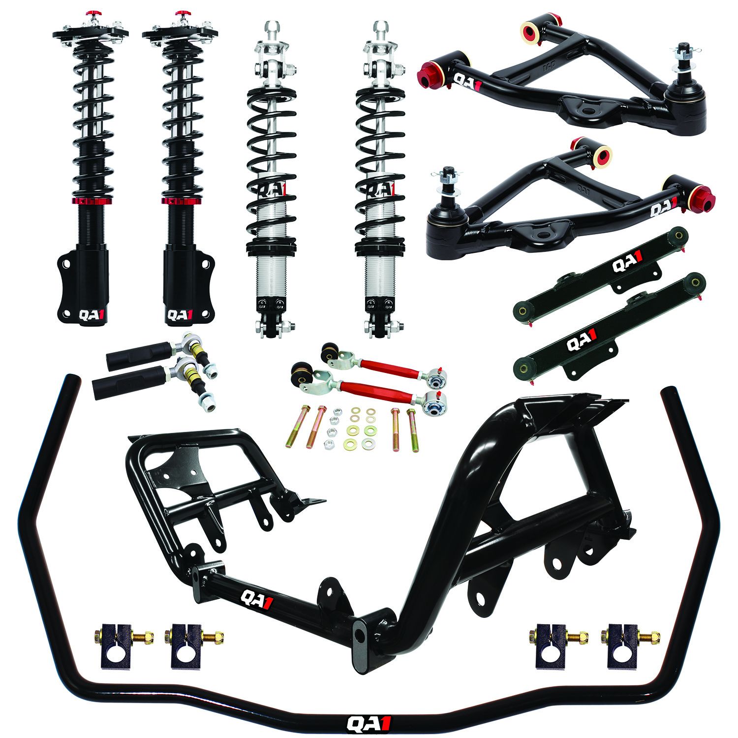 Product Overview The QA1 Level 2 Drag Kit is a serious upgrade for any Fox Body Mustang owner drag racing their car. The kit includes a lightweight tubular K-member, drag race control arms, boxed trailing arms, rear sway bar, and front and rear double adjust coilovers. Tubular Front K-member These are designed to save weight and free up room in your engine bay. Weighing only 25lbs., it's 50% lighter than stock K-members and boasts improved geometry and durability. Interchangeable engine mounts, sold separately, offer flexibility for running factory or late model engines including Coyotes. Inverted Front Struts and Rear Coil-Overs Front struts feature an inverted cartridge design, large diameter shaft, and lightweight aluminum body for improved suspension performance. The lightweight, high-travel springs with proven spring rates optimize weight transfer, reducing 60-foot times and ET's These kits offer up to 2" lower than stock ride height adjustment to dial in the perfect stance. Double-adjustable rear coilovers are great for serious track cars looking to further tune their rear suspension. Lightweight Caster Camber Plates Aluminum caster camber plates improve Mustang handling and performance. Lighter and sleeker than steel, they offer precision adjustment to fine-tune suspension geometry for straight line stability. Tubular Control Arms, Trailing Arms and Rear Sway Bar Tubular control arms, trailing arms, and rear sway bars solve flexing and bushing bind, allowing smoother suspension movement and straighter launches. Easy, Bolt-In Installation Made in the USA Fitment Notes Engine mounts not included. QA1 offers several mounts for factory engines as well as popular engine swaps which are sold separately. For Fox Body: Kits for early year range Fox Bodies 1979-1986 will retain factory track width – narrow Kits for late year range Fox Bodies 1987-1993 will retain track width of the factory '87-'93 V8 cars – wide Not compatible with Cobra IRS