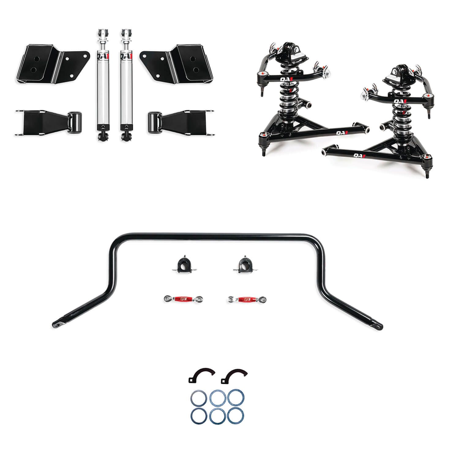 Product Overview Take control of your NBS truck’s stance, comfort, and handling with this complete bolt-on suspension system from QA1. Designed for short bed 2WD Silverado and Sierra models, this Level 1 kit includes adjustable coil-overs, upgraded control arms, a matched rear drop kit, and a 1.5" front sway bar to deliver a confident, responsive ride without cutting or welding. Whether you're daily driving, weekend cruising, or starting your first build, this kit gives you everything you need to transform how your truck looks and drives. RIDE HEIGHT ADJUSTABILITY WITH COIL-OVER CONTROL QA1’s front coil-overs give you 1" to 3" of ride height adjustability right out of the box. Want to go lower? Pair them with QA1’s 2" drop spindles (Part Number: 9056-120) for a total drop range of 3" to 5" up front. Whether you're aiming for a subtle level or a slammed street look, this setup lets you get it just right. UPGRADED CONTROL ARMS + SWAY BAR FOR BETTER FEEL This kit includes QA1’s strong yet lightweight tubular front control arms, which improve geometry for lowered trucks. Pair that with a beefy 1.5" diameter front sway bar to help flatten out corners and reduce body roll. REAR DROP KITS FOR THE PERFECT STANCE This kit includes an adjustable rear drop kit that lowers your Silverado or Sierra between 2"–4" using QA1 shocks, shackles, and hangers. DIAL IN YOUR COMFORT AND PERFORMANCE Tailor the driving feel to your liking with QA1 single adjustable shocks. These shocks offer 18 clicks of combined compression and rebound adjustment to dial in a balance of performance and comfort. EASY BOLT-IN INSTALL Everything in this kit is designed to bolt on with no welding. MADE IN THE USA LIMITED LIFETIME WARRANTY QA1 shocks are eligible for a Limited Lifetime Warranty Fitment Notes Fits 1999–2006 Chevrolet Silverado and GMC Sierra 1500 2WD short bed models with coil front suspension: Not compatible with vehicles originally equipped with torsion bar front suspension