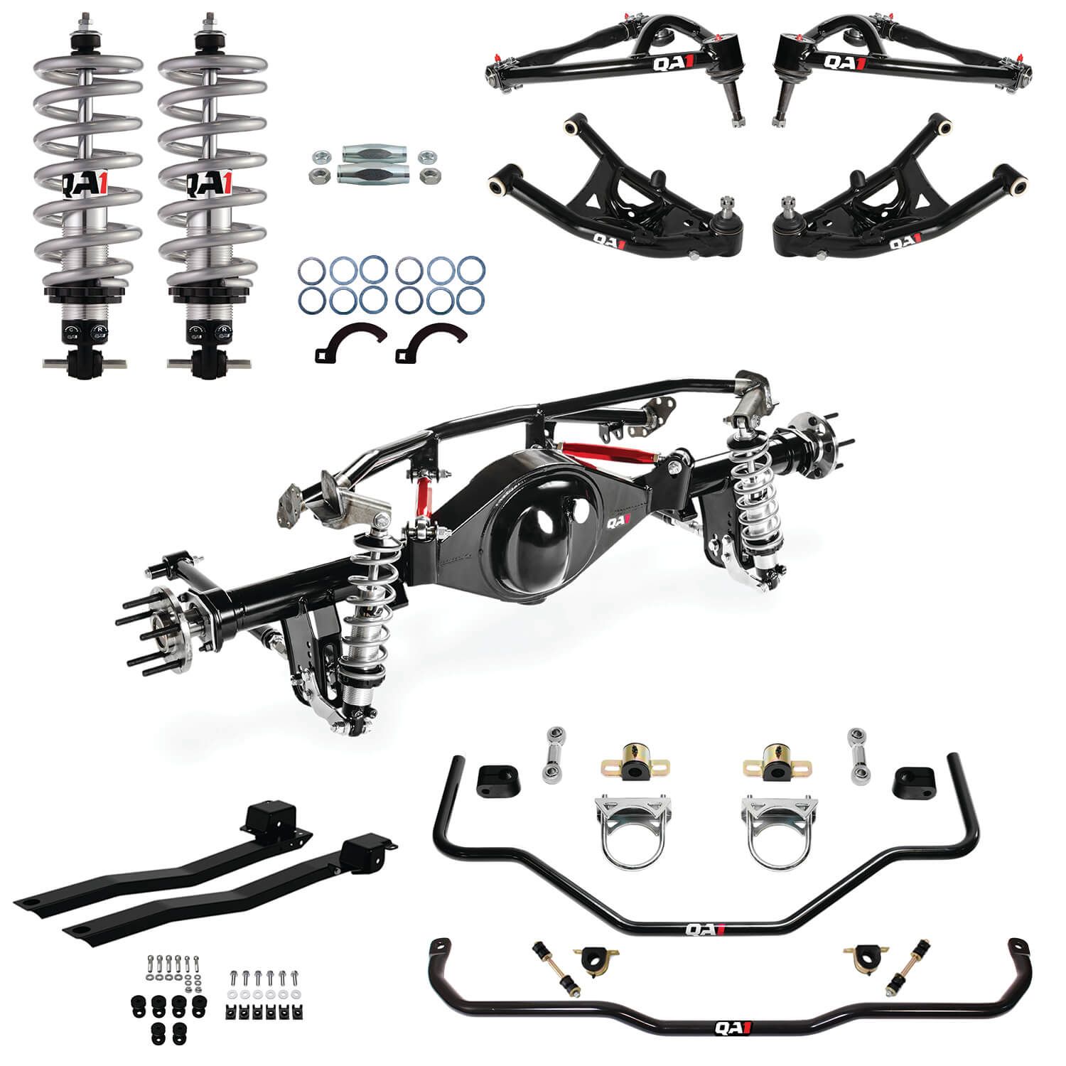 PRODUCT OVERVIEW QA1's Handling Kit is the ideal suspension upgrade for '68-'72 X-Body Nova owners wanting improved street and track performance. This complete solution replaces the front and rear suspension with adjustable coilovers and a 4-link setup, optimized for wider wheels and tires, plus a custom QA1 9" rear housing. SIGNIFICANT HANDLING IMPROVEMENTS Experience superior handling with lightweight tubular control arms, low-friction ball joints, and polyurethane bushings that improve geometry and reduce flex. The adjustable four-link design eliminates wheel hop, increases traction, and provides tunable handling. Front and rear sway bars and subframe connectors reduce roll in tight corners. OPTIMAL STANCE QA1's coilovers and tubular 4-link offer up to 2 inches of front adjustability and -3 to +2 inches in the rear for the perfect stance, shifting components inward for extra clearance with wider wheels. PERFORMANCE 9" REAR HOUSING Strength: Fabricated center section with 3" OD, " wall axle tubes support 800HP and 31 spline axles are rated to 650HP. Features: Standard options include powder coat, drain and fill plugs, jack pad, and all necessary hardware. Specs: Factory wheel mounting width of 60" Big Ford "New Style Torino Axle Flanges" with 2.5" axle offset Bolt pattern: 5×4-3/4" for easy wheel compatibility Wheel studs: " x 3" for alloy wheels Requires third member for Ford 9" housings with 31 spline axles EASY INSTALL The QA1 Handling Kit features a straightforward installation. The rear crossmember needs minimal MIG welding, and both the rear housing and front suspension are direct bolt-ins. MADE IN THE USA Components manufactured in the USA LIFETIME WARRANTY Register at QA1.net/warranty for lifetime coverage on your QA1 shocks FITMENT NOTES Verify wheel and tire fitment on the vehicle Mini tubs required for maximum tire width Some welding is required Exhaust modifications may be needed