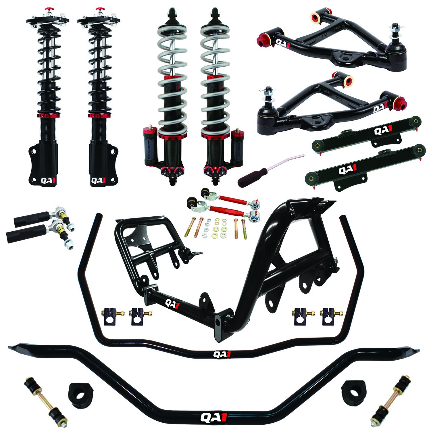 Product Overview The QA1 Level 3 Handling Kit is a serious upgrade for people seeking ultimate handling and performance from their Fox Body Mustang. The kit includes a lightweight tubular K-member, control arms, boxed trailing arms, sway bars, and front double adjustable coilovers and rear MOD Series coilovers. Tubular Front K-member These are designed to save weight and free up room in your engine bay. Weighing only 25lbs., it's 50% lighter than stock K-members and boasts improved geometry and durability. Interchangeable engine mounts, sold separately, offer flexibility for running factory or late model engines including Coyotes. Inverted Front Struts and Rear Coil-Overs Front struts feature an inverted cartridge design, large diameter shaft, and lightweight aluminum body for improved suspension performance. Paired with lightweight, high-travel springs with hand-selected rates perfect for flat cornering autocross and road race Mustangs. These kits offer up to 2" lower than stock ride height adjustment to dial in the perfect stance. MOD Series rear coilovers provide competition cars with an unmatched level of tunability and control. Lightweight Caster Camber Plates Aluminum caster camber plates improve Mustang handling and performance. Lighter and sleeker than steel, they offer precision adjustment to fine-tune suspension geometry for optimal performance. Tubular Control Arms, Trailing Arms and Rear Sway Bar Tubular control arms, trailing arms, and sway bars solve flexing and bushing bind. Easy, Bolt-In Installation Made in the USA Fitment Notes Engine mounts not included. QA1 offers several mounts for factory engines as well as popular engine swaps which are sold separately. For Fox Body: Kits for early year range Fox Bodies (1979-1986) will retain factory track width (narrow.) Kits for late year range Fox Bodies (1987-1993) will retain track width of the factory '87-'93 V8 cars (wide.) Not compatible with Cobra IRS