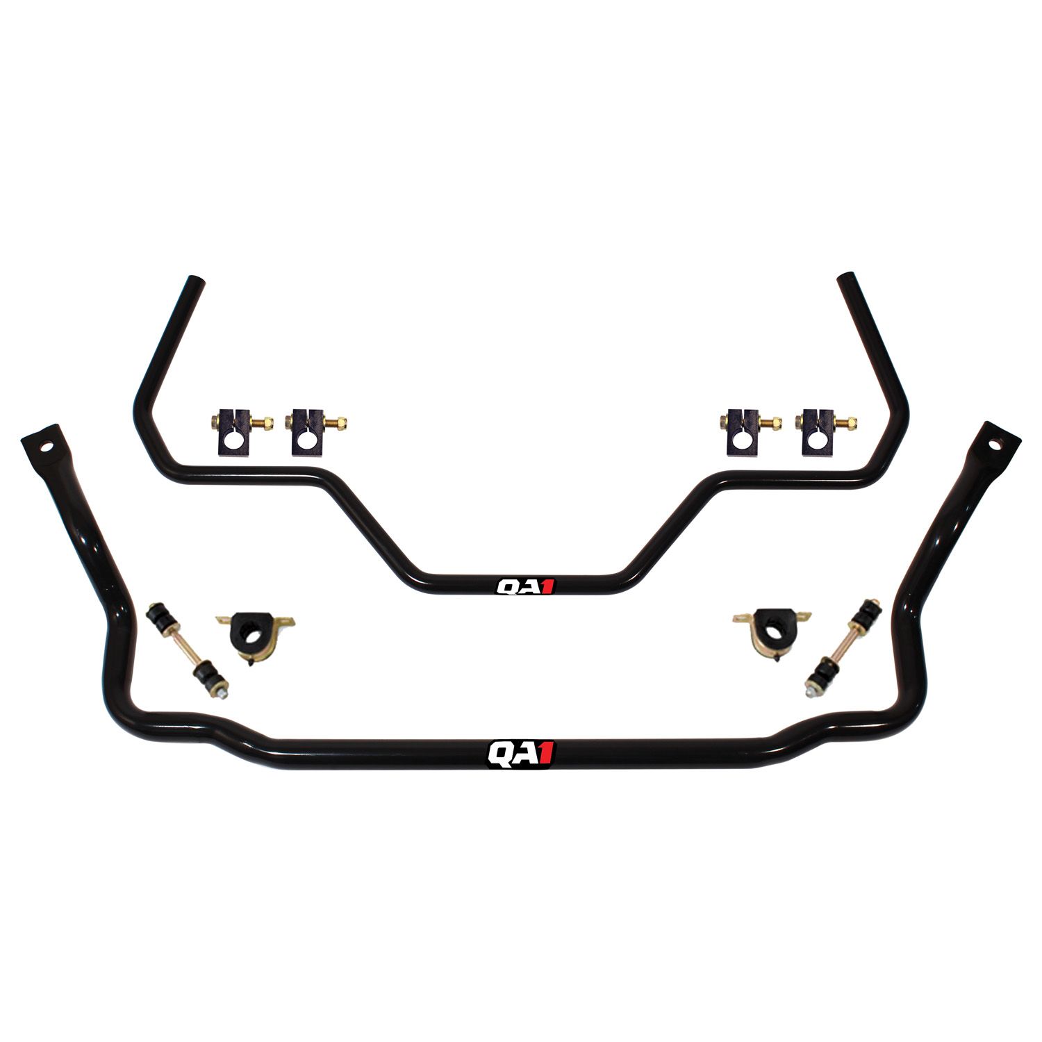 QA1 Front Sway Bars are manufactured from lightweight hollow-core (4130) Chromoly steel for maximum strength and durability. The CNC forming ensured precision fitment for a true bolt-on installation. A gloss black powder coated finish is applied for lasting durability and corrosion resistance. They also include greasable graphite polyurethane bushings and high quality plated hardware. QA1 Rear Sway Bars are manufactured from heavy duty solid-core(1045) cold formed steel for maximum strength. Precision CNC forming ensures proper fitment for a true bolt-on installation. A gloss black powder coated finish is applied for lasting durability and corrosion resistance. They include greaseable graphite polyurethane bushings, U-bolts and high quality plated hardware.