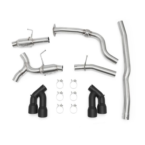 TechSpec Includes: (1) Stainless Steel Front Pipe w/ 2-Bolt Flange–(1) Stainless Steel Mid Pipe–(1) Stainless Steel Rear Pipe–(2) Stainless Steel Mufflers–(2) 4.5-inch Double Wall Exhaust Tips–(4) 3-inch Exhaust Band Clamps–(2) Locking Nuts–Mishimoto Lifetime Warranty