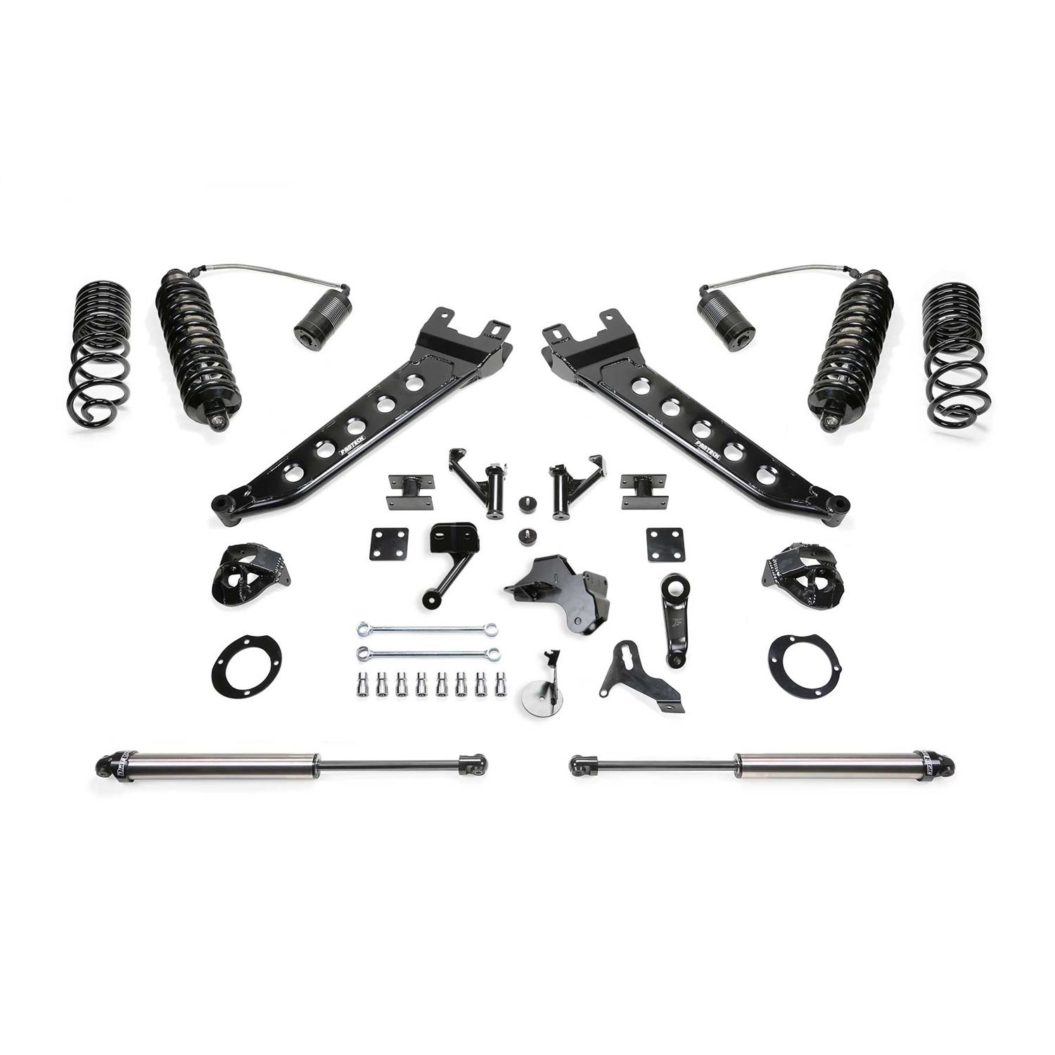 Improving on the Ram suspension design, Fabtech offers their trademark Radius Arms in a complete lift kit. These exclusive tubular Radius Arms have recognizable dimple die side plates for superior strength and a signature of quality. The rugged Arms provide increased caster for use with oversized tires and lifted suspension heights. For maximum suspension damping, this Ram lift kit features the massive stainless steel Dirt Logic 4.0 Coilovers. These top shelf Coilovers bolt to the factory upper coil bucket with support gussets for superior strength. The lower mounts weld to the axle housing and have cross support gussets for the factory Track Bar bracket. Heavy duty 1/4 in. thick steel front and rear Track Bar drop brackets center the axles under the vehicle with the new ride height. For the rear, this lift kit has the perfect balance between ride quality and retaining the factory carrying capacity. By utilizing a dual rate spring design, it provides a good highway ride in the first stage of compression then the second stage handles heavy loads. This high end lift kit system is the ultimate suspension upgrade for Ram 2500.
