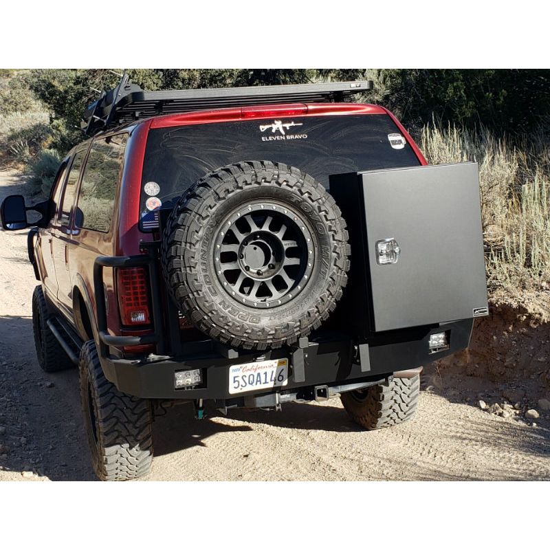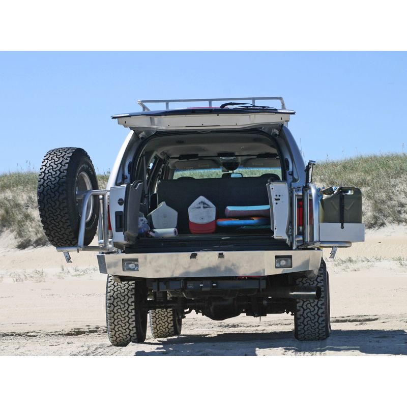 Storage is a premium when taking your family on long vacations, and if your Excursion has over-sized tires then you also have to compete with a tire that no longer fits underneath your vehicle. The solution is an Aluminess Rear Bumper. With 2 swing arms to hold your spare tire and a storage box you will now have more room for the essentials inside your Excursion. In most cases any of the Aluminess boxes will work on the swing arm, so whether its extra fuel, a generator, or recovery gear that you need, your Aluminess Rear Bumper is there to save the day.
