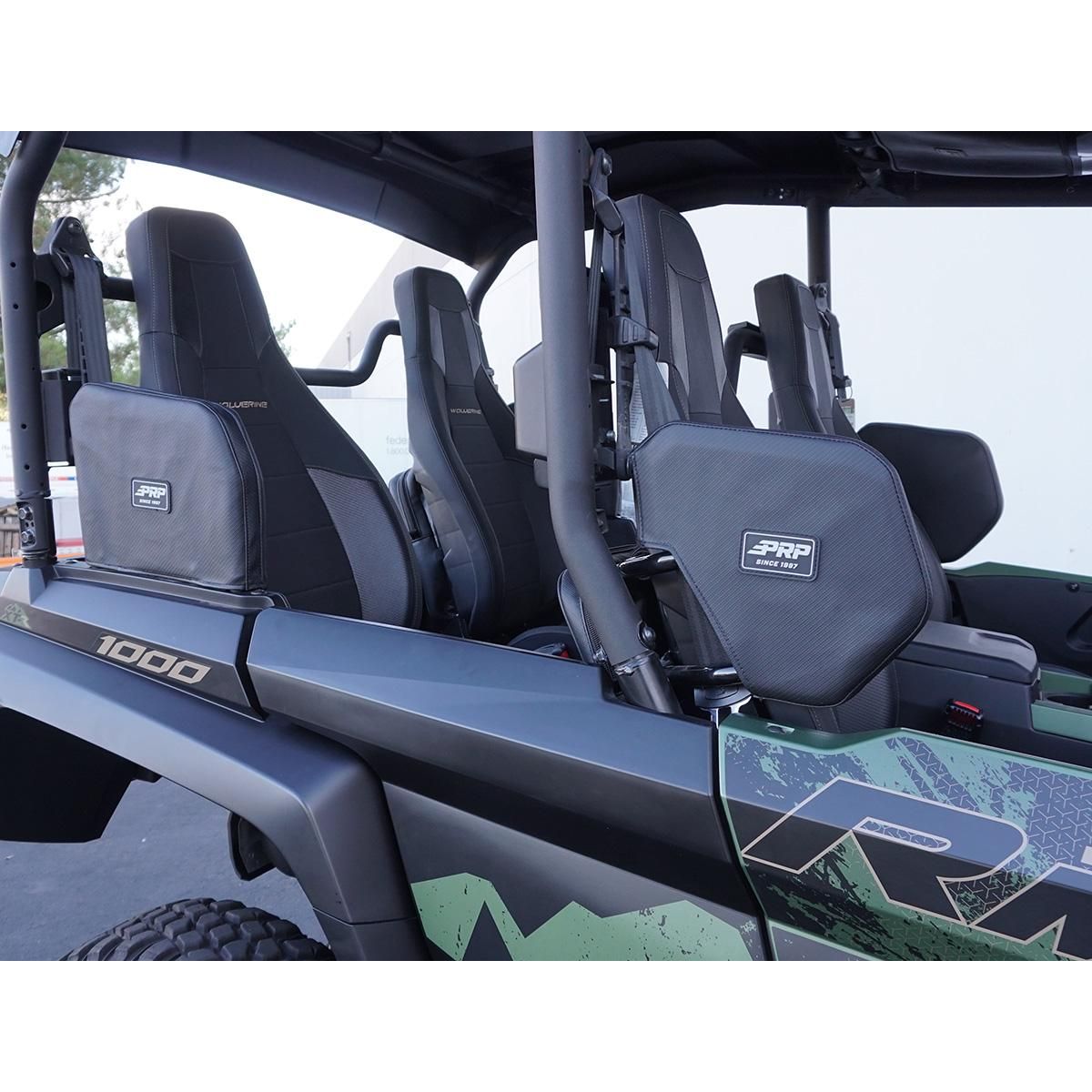 Add extra protection and comfort for the rear passengers in your Yamaha Wolverine RMAX4. While the plastic bumper guards next to the seats do help you stay inside the vehicle, they aren't the most comfortable thing to bang your shoulder against in rough terrain. That's where PRP's shoulder pads come in handy. They easily slide over those plastic bumpers, and provide a soft cushion to those hard hits. Each is made with a thick foam padding covered with durable and puncture resistant marine-grade vinyl that is water resistant. Fits 2020+ Yamaha Wolverine RMAX4. Sold as a pair (for rear driver and passenger sides)